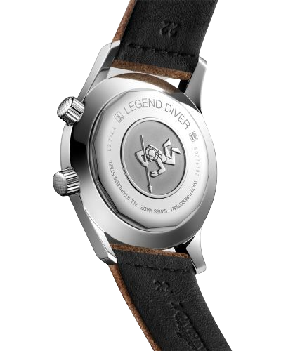 Швейцарские механические часы с автоподзаводом Longines Legend Diver Watch L3.774.4.60.2. Циферблат отличается улучшенной читабельностью показателей благодаря крупной индикации времени, стрелками и метками с люминесцентной подсветкойЛюминесцентное покрытиеПозволяет считывать показания времени в темноте. Производители наносят на стрелки, часовые индексы, безель или поверхность циферблата светонакопительный состав, дающий холодное свечение., антибликовому покрытиюАнтибликовое покрытиеСлой оксида металла в 0,13-0,3 микрон, благодаря которому стекло часов не бликует и не отражает свет. Антибликовое покрытие уменьшает отражение света в 10 раз, обеспечивая отличную читаемость показателей циферблата. сапфирового стеклаСапфировое стеклоПрочный и надёжный материал из кристалла сапфира синтетического происхождения, характеризующийся особой твёрдостью и устойчивостью к царапинам и повреждениям.. Окошко даты находится в положении 3 часа. Автоматический механизм с частотой баланса 25 200 полуколебаний в час и запасом хода, которого хватает примерно на 72 часа работы. Кожаный ремешок на стандартной застёжке.