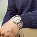 Дополнительные особенности включают сапфировое стеклоСапфировое стеклоПрочный и надёжный материал из кристалла сапфира синтетического происхождения, характеризующийся особой твёрдостью и устойчивостью к царапинам и повреждениям. с двухсторонним антибликовым покрытиемАнтибликовое покрытиеСлой оксида металла в 0,13-0,3 микрон, благодаря которому стекло часов не бликует и не отражает свет. Антибликовое покрытие уменьшает отражение света в 10 раз, обеспечивая отличную читаемость показателей циферблата., что обеспечивает отличную видимость циферблата в любых условиях. Стрелки и метки с люминесцентнымЛюминесцентное покрытиеПозволяет считывать показания времени в темноте. Производители наносят на стрелки, часовые индексы, безель или поверхность циферблата светонакопительный состав, дающий холодное свечение. покрытием облегчают чтение времени в темноте. Часы обладают классом водозащиты 100 метров, что позволяет использовать их для плавания и занятий водными видами спорта. Стальной браслет с застёжкой «бабочка» с кнопкамиЗастёжка "бабочка"Такой вид застёжки дополняется предохранителями, помогающими избежать случайного раскрытия браслета. Обладают изящным исполнением. придает часам дополнительную надежность и комфорт при ношении.