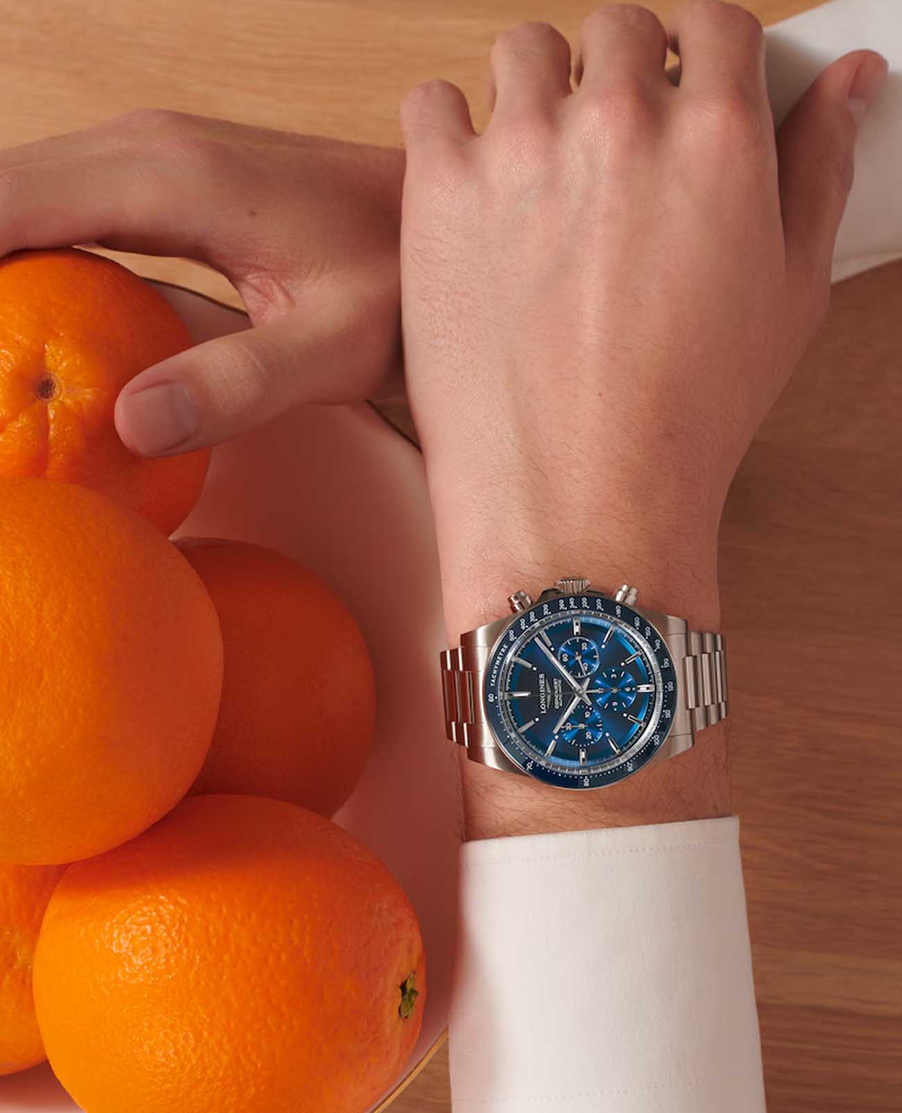 Мужские швейцарские механические часы- хронографХронографФункция позволяет измерять отрезки времени с особой точностью: часы, минуты, секунды. Верным признаком хронографа является наличие на циферблате 3 дополнительных окошек-счётчиков. Longines Conquest L3.835.4.92.6. Сапфировое стеклоСапфировое стеклоПрочный и надёжный материал из кристалла сапфира синтетического происхождения, характеризующийся особой твёрдостью и устойчивостью к царапинам и повреждениям. с многослойным антибликовым покрытием с обеих сторон, устойчивое к появлению царапин, обладающее высокой прозрачностью. Корпус часов изготовлен из стали. Неподвижный безельБезельВнешний ободок, закрепляющий стекло. В спортивных часах так называется поворотное кольцо с делениями на циферблате, выполняет роль таймера – замеряет отрезки времени на шкале. Неподвижный безель – элемент декора. Однонаправленно вращающийся безель на дайверских часах позволяет фиксировать моменты погружения и выныривания на поверхность. из стали и керамики, защищенный от царапин, никогда не изнашивается и не выцветает. Шкала тахиметрТахиметрРазмеченная шкала, располагается на ободке или безеле часов. Тахиметр позволяет рассчитать скорость на определённом участке пути, расстояние измеряется в километрах или милях.. На циферблате расположены три дополнительных индикатора. Стрелки и метки с люминесцентным покрытиемЛюминесцентное покрытиеПозволяет считывать показания времени в темноте. Производители наносят на стрелки, часовые индексы, безель или поверхность циферблата светонакопительный состав, дающий холодное свечение.. Класс водозащиты: 100 метров, позволит плавать, нырять и заниматься другими водными видами спорта. Стальной браслет на раскладной застёжкеРаскладная застёжкаТакой тип застёжки используется только на браслетах из металла. Она никогда не раскрывается полностью, происходит разделение на 2 и более частей. Раскладывающая застёжка снизит вероятность потери часов к минимуму..