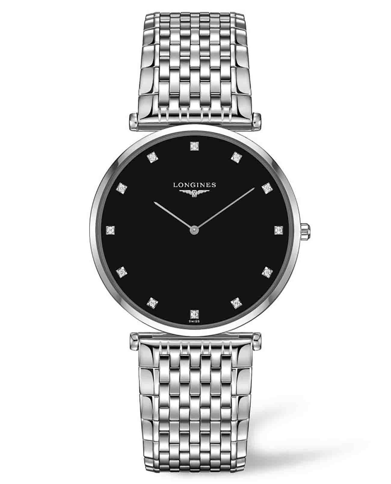 Чёрный лаковый циферблат с 12 бриллиантами в 0,081 карата привлекательно смотрится в сочетании со стальным браслетом с мелкими звеньями. Швейцарский кварцевый механизм L420 обеспечивает высокую точность хода. Сапфировое стекло на 100% устойчиво к появлению царапин.