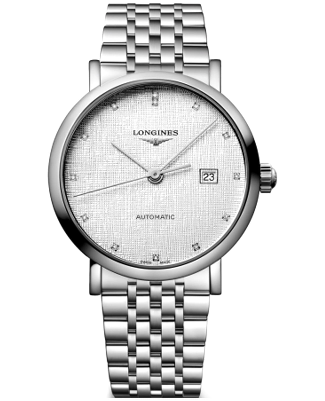 Изысканные мужские часы Longines Elegant Collection L4.910.4.79.6 — это воплощение спокойной роскоши и вечного стиля. Все элементы циферблата подчеркивают элегантность и классический вкус модели. Корпус часов изготовлен из нержавеющей стали, диаметром 39 мм. Защиту циферблата обеспечивает прочное сапфировое стеклоСапфировое стеклоПрочный и надёжный материал из кристалла сапфира синтетического происхождения, характеризующийся особой твёрдостью и устойчивостью к царапинам и повреждениям. с антибликовым покрытиемАнтибликовое покрытиеСлой оксида металла в 0,13-0,3 микрон, благодаря которому стекло часов не бликует и не отражает свет. Антибликовое покрытие уменьшает отражение света в 10 раз, обеспечивая отличную читаемость показателей циферблата. гарантирующее четкость показаний. Циферблат украшен 13 бриллиантами Top Wesselton VS-SI общим весом 0,032 карата. Автоматический механизм L888 обеспечивает высокую точность и простоту использования. Водостойкость до 30 метров позволит плавать, нырять и заниматься другими водными видами спорта. Изысканный браслет выполнен из нержавеющей стали на застёжке-бабочке с кнопкамиЗастёжка "бабочка"Такой вид застёжки дополняется предохранителями, помогающими избежать случайного раскрытия браслета. Обладают изящным исполнением. , обеспечивающей комфортное ношение и надёжную фиксацию на запястье. Окошко даты в положении 3 часа. Коллекция The Elegant Collection сочетает в себе классическую элегантность и современный подход к дизайну, делая эти часы универсальным аксессуаром — как для торжественных случаев, так и для повседневной жизни.