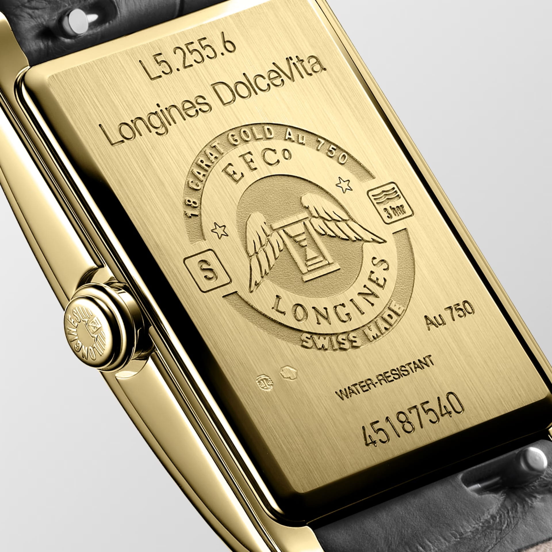 Женские швейцарские часы Longines DolceVita L5.255.6.75.2, кварцевый механизм с высокой точностью. Сапфировое стеклоСапфировое стеклоПрочный и надёжный материал из кристалла сапфира синтетического происхождения, характеризующийся особой твёрдостью и устойчивостью к царапинам и повреждениям. устойчивое к появлению царапин, обладающее высокой прозрачностью. Корпус часов изготовлен из 18-каратного золота18-каратное золотоОбозначение по каратной системе пробирования, оно показывает, сколько драгоценного металла содержится в изделии. 18 карат - в составе 75% чистого золота, соответствует 750 пробе.