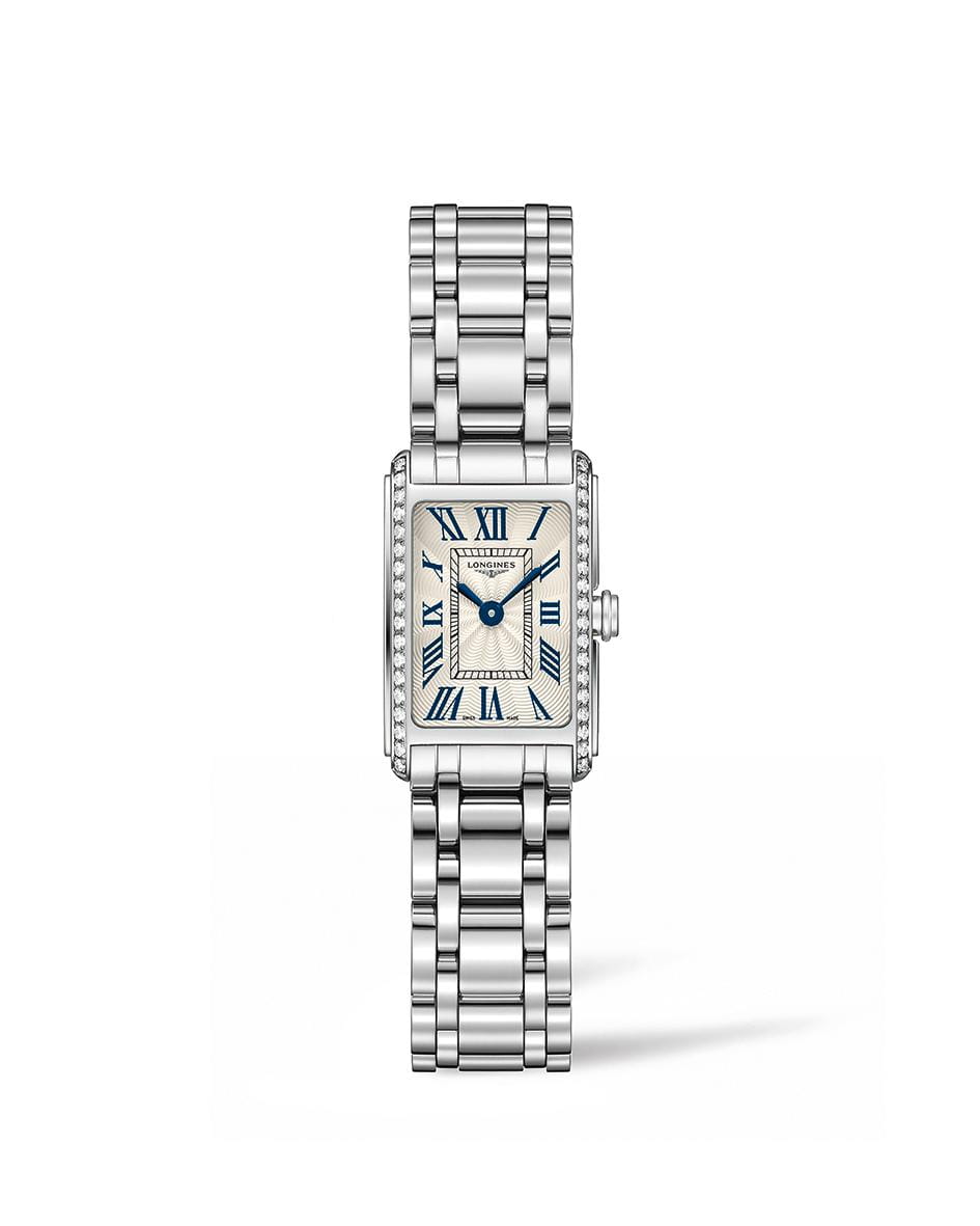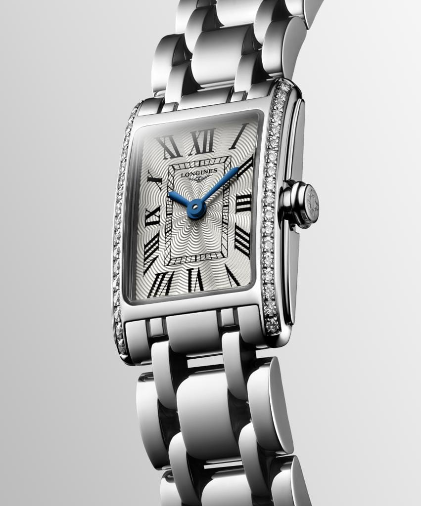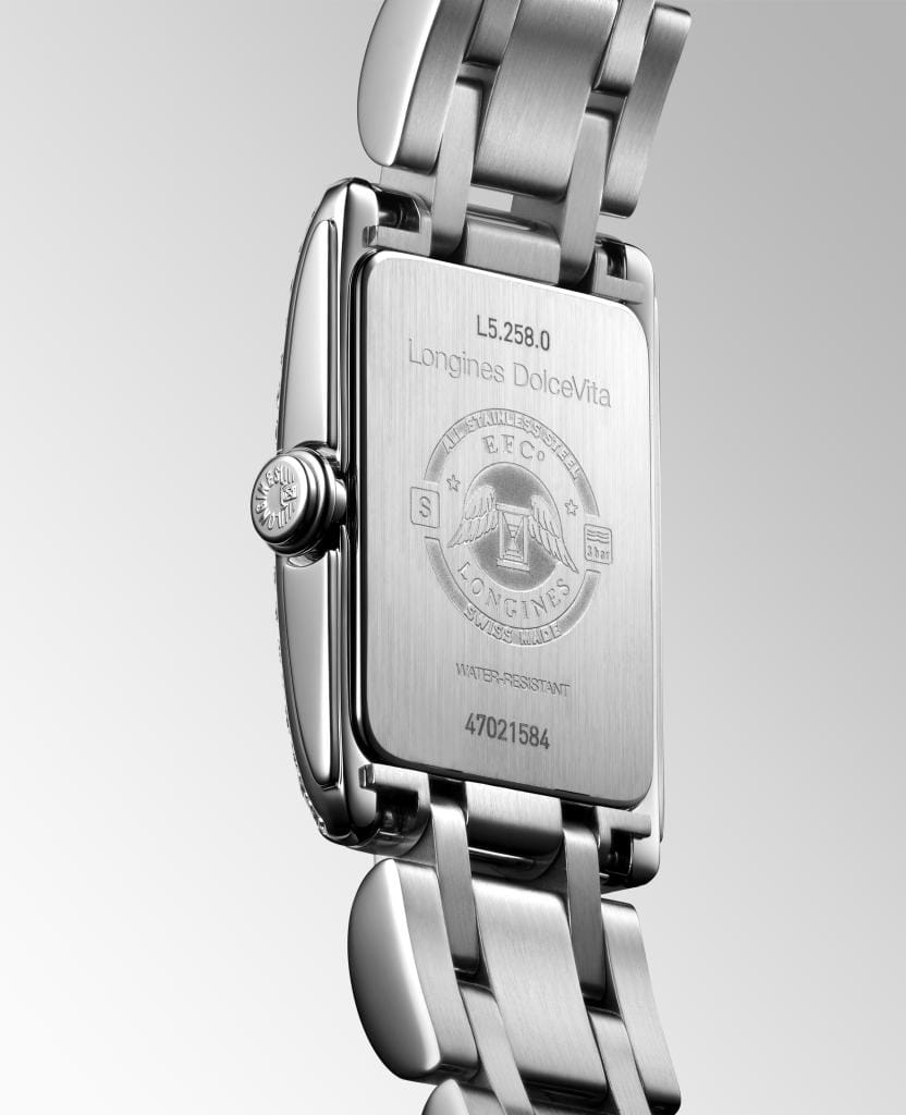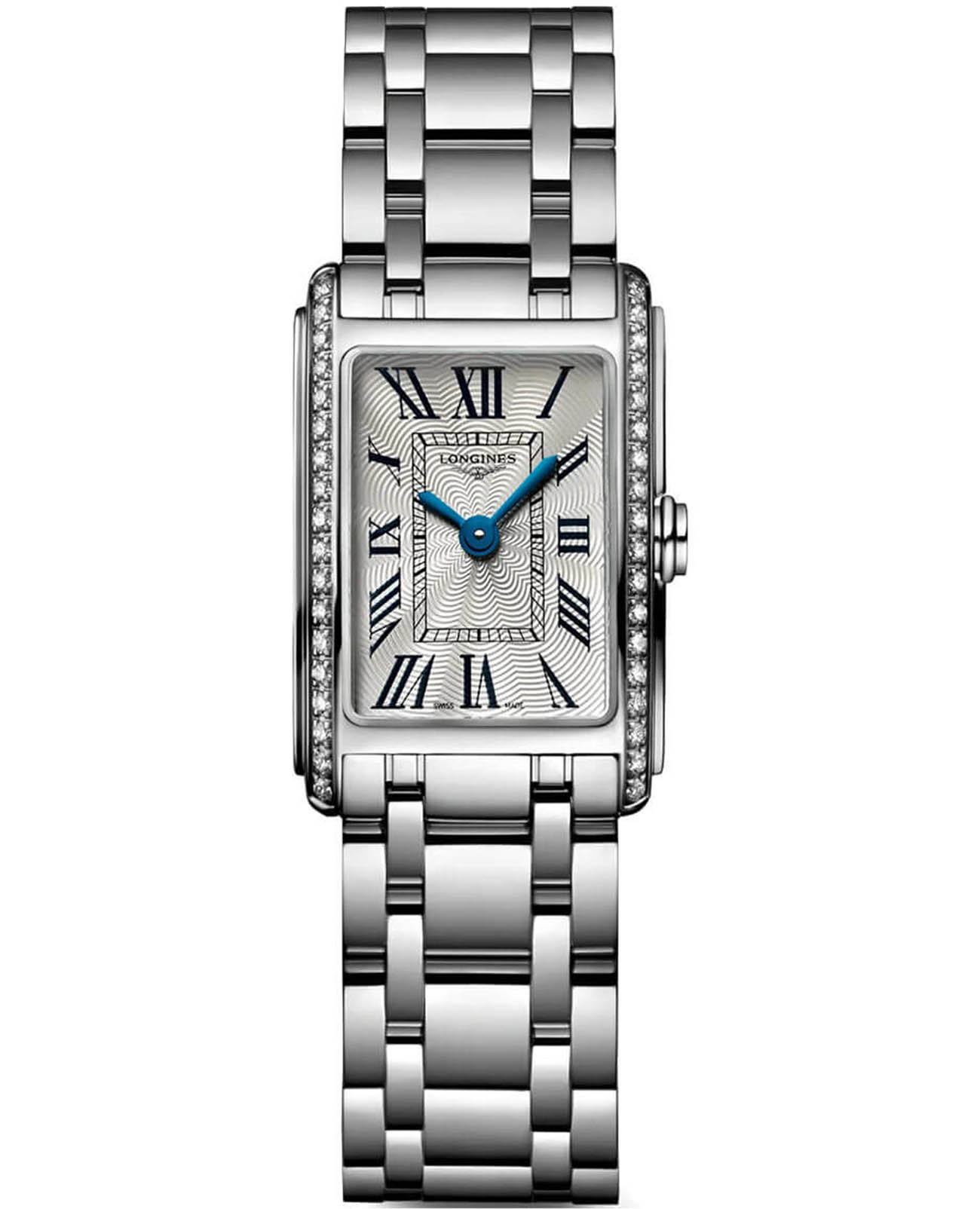 Женские швейцарские часы Longines DolceVita L5.258.0.71.6, кварцевый механизм с высокой точностью. Сапфировое стеклоСапфировое стеклоПрочный и надёжный материал из кристалла сапфира синтетического происхождения, характеризующийся особой твёрдостью и устойчивостью к царапинам и повреждениям. устойчивое к появлению царапин, обладающее высокой прозрачностью. Корпус с 36 бриллиантами группы Top Wesselton IF-VVS общим весом 0.280 карата. Класс водозащиты: 30 метров, позволит защитить корпус от случайных брызг или капель дождя. Браслет из нержавеющей стали на застёжке-бабочке с кнопкамиЗастёжка "бабочка"Такой вид застёжки дополняется предохранителями, помогающими избежать случайного раскрытия браслета. Обладают изящным исполнением. .