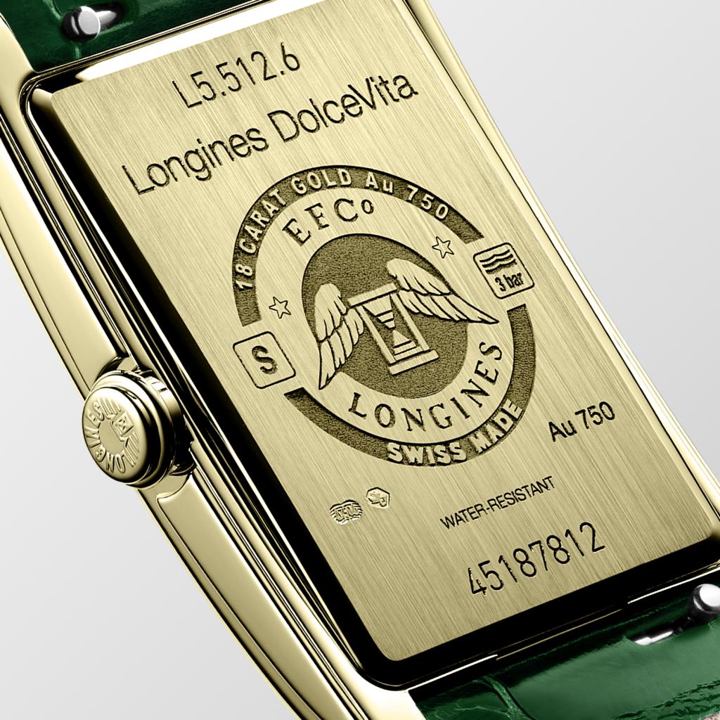 Женские швейцарские часы Longines DolceVita L5.512.6.95.2 , кварцевый механизм с высокой точностью. Сапфировое стеклоСапфировое стеклоПрочный и надёжный материал из кристалла сапфира синтетического происхождения, характеризующийся особой твёрдостью и устойчивостью к царапинам и повреждениям. устойчивое к появлению царапин, обладающее высокой прозрачностью. Корпус часов изготовлен из 18-каратного золота18-каратное золотоОбозначение по каратной системе пробирования, оно показывает, сколько драгоценного металла содержится в изделии. 18 карат - в составе 75% чистого золота, соответствует 750 пробе.