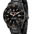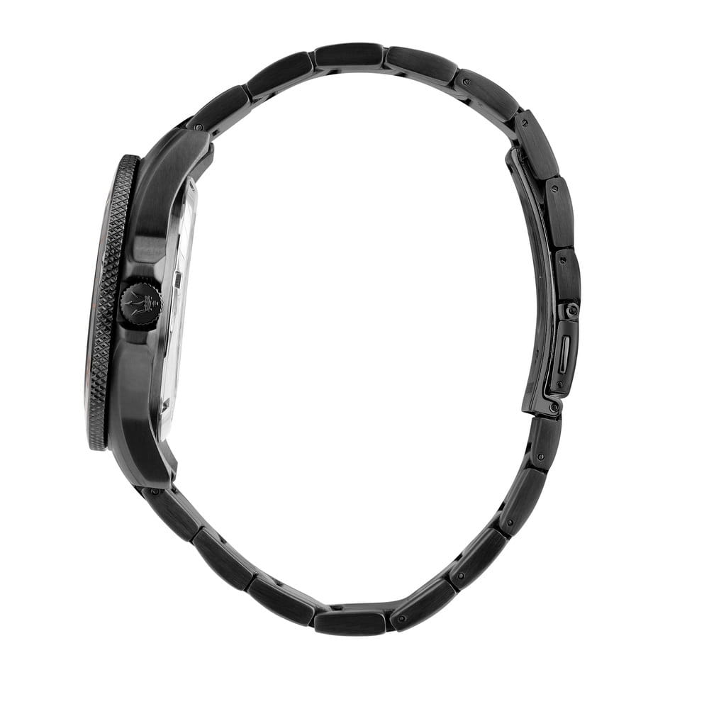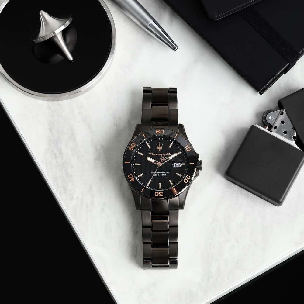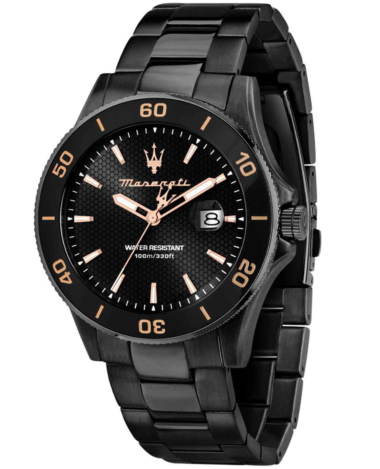 Мужские часы Maserati R8853100035 — это стильное сочетание элегантности и современного дизайна. Корпус из нержавеющей стали с IP-покрытиемIP-покрытиеМетод ионного напыления. Демонстрирует повышенную устойчивость к истиранию, окислению и химическим веществам. Под воздействием высокого давления и температуры около 1500°C молекулы металла надёжно соединяются с частицами корпуса часов. диаметром 43 мм идеально сбалансирован и элегантен. Минеральное стеклоМинеральное стеклоМинеральное стекло представляет собой искусственно выращенный минерал кварца. Такое стекло отличается особой устойчивостью к повреждениям и царапинам. Уступает по некоторым качествам сапфировому стеклу. защищает циферблат от царапин. Стальной браслет на застёжке-бабочке с кнопкамиЗастёжка "бабочка"Такой вид застёжки дополняется предохранителями, помогающими избежать случайного раскрытия браслета. Обладают изящным исполнением. идеально дополняют дизайн часов, обеспечивая комфортное ношение. Стрелки и метки с люминесцентным покрытиемЛюминесцентное покрытиеПозволяет считывать показания времени в темноте. Производители наносят на стрелки, часовые индексы, безель или поверхность циферблата светонакопительный состав, дающий холодное свечение.. Керамический безельБезельВнешний ободок, закрепляющий стекло. В спортивных часах так называется поворотное кольцо с делениями на циферблате, выполняет роль таймера – замеряет отрезки времени на шкале. Неподвижный безель – элемент декора. Однонаправленно вращающийся безель на дайверских часах позволяет фиксировать моменты погружения и выныривания на поверхность.. Часы обладают впечатляющей водонепроницаемостью до 10 бар (100 метров), что делает их идеальными для повседневной носки. Метки в виде штрихов. Окошко даты с увеличительным стеклом находится в положении 3 часа.