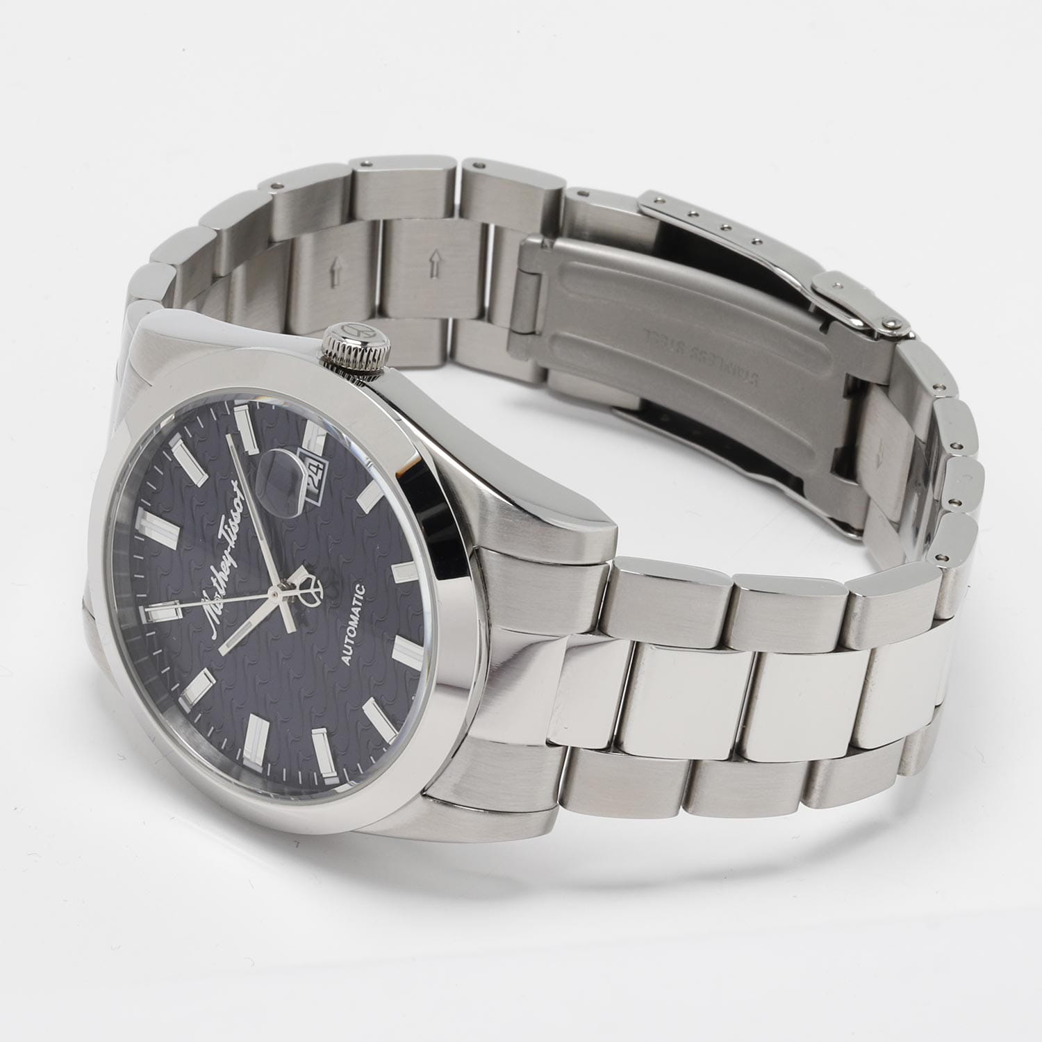 Мужские механические часы с автоподзаводом Mathey-Tissot Mathy H1450ATB — это стильное сочетание элегантности и современного дизайна. Изящный корпус выполнен из нержавеющей стали, диаметром 42 мм, что придаст образу элегантности и надежности. Изысканный циферблат с метками в виде штрихов придает модели особый блеск. Циферблат защищен минеральным стекломМинеральное стеклоМинеральное стекло представляет собой искусственно выращенный минерал кварца. Такое стекло отличается особой устойчивостью к повреждениям и царапинам. Уступает по некоторым качествам сапфировому стеклу. с сапфировым покрытием, обеспечивает устойчивость к царапинам. Стрелки и метки с люминесцентным покрытиемЛюминесцентное покрытиеПозволяет считывать показания времени в темноте. Производители наносят на стрелки, часовые индексы, безель или поверхность циферблата светонакопительный состав, дающий холодное свечение.. Окошко даты находится в положении 3 часа. Стальной браслет на раскладной застёжке с фиксаторомРаскладная застёжкаТакой тип застёжки используется только на браслетах из металла. Она никогда не раскрывается полностью, происходит разделение на 2 и более частей. Раскладывающая застёжка снизит вероятность потери часов к минимуму., гарантирует комфортное и безопасное ношение. Рифленая заводная головка. Класс водозащиты: 50 метров позволит защитить корпус от случайных брызг или капель дождя. Mathey-Tissot  — отличный выбор для тех, кто ценит утонченность и качество.
