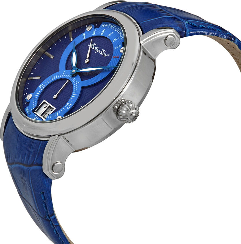 Mathey-Tissot Retrograde H7022ABU — практичные часы с ярким дизайном и ретроградным указателем дня недели станут отличным вариантом на каждый день. Изящный корпус выполнен из нержавеющей стали, диаметром 43 мм, что придаст образу элегантности и надежности. Изысканный циферблат с метками в виде штрихов придает модели особый блеск. Циферблат защищен минеральным стекломМинеральное стеклоМинеральное стекло представляет собой искусственно выращенный минерал кварца. Такое стекло отличается особой устойчивостью к повреждениям и царапинам. Уступает по некоторым качествам сапфировому стеклу., обеспечивает устойчивость к царапинам. Стрелки с люминесцентным покрытиемЛюминесцентное покрытиеПозволяет считывать показания времени в темноте. Производители наносят на стрелки, часовые индексы, безель или поверхность циферблата светонакопительный состав, дающий холодное свечение.. Окошко даты находится в положении 6 часов. Часы оснащены надежным кварцевым механизмом. Кожаный ремешок на раскладной застёжкеРаскладная застёжкаТакой тип застёжки используется только на браслетах из металла. Она никогда не раскрывается полностью, происходит разделение на 2 и более частей. Раскладывающая застёжка снизит вероятность потери часов к минимуму. гарантирует комфортное и безопасное ношение. Класс водозащиты: 50 метров позволит защитить корпус от случайных брызг или капель дождя. Mathey-Tissot  — отличный выбор для тех, кто ценит утонченность и качество.