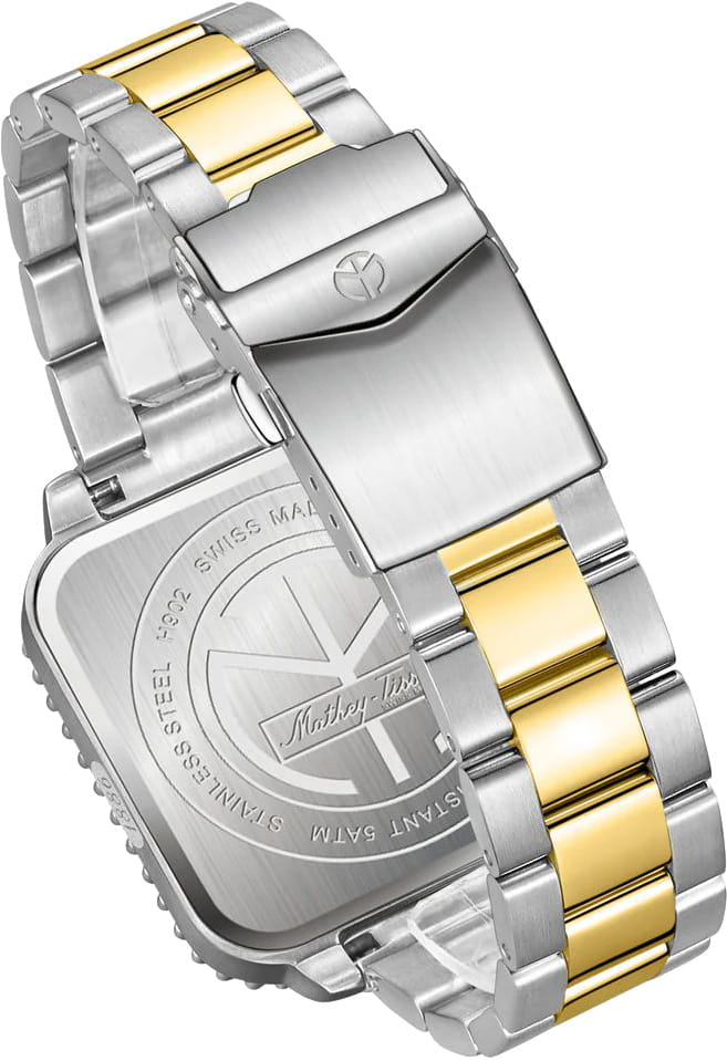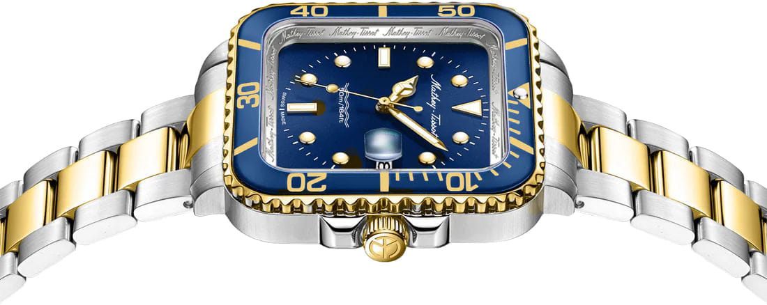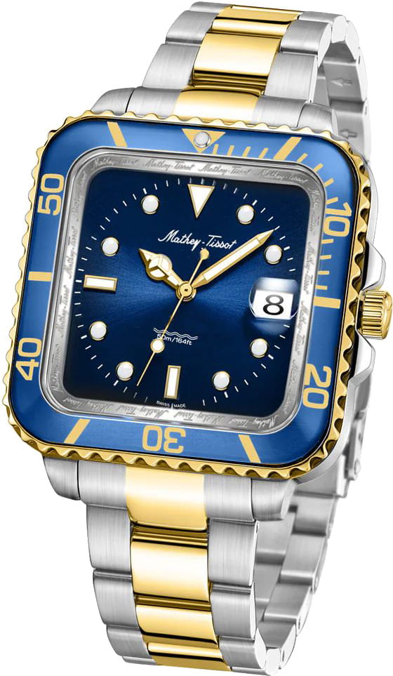 Мужские кварцевые часы Mathey-Tissot Mathy H902QBBU — это стильное сочетание элегантности и современного дизайна. Изящный корпус выполнен из нержавеющей стали, диаметром 42 мм, что придаст образу элегантности и надежности. Изысканный циферблат с метками в виде точек придает модели особый блеск. Циферблат защищен сапфировым стекломСапфировое стеклоПрочный и надёжный материал из кристалла сапфира синтетического происхождения, характеризующийся особой твёрдостью и устойчивостью к царапинам и повреждениям., обеспечивает устойчивость к царапинам. Стрелки и метки с люминесцентным покрытиемЛюминесцентное покрытиеПозволяет считывать показания времени в темноте. Производители наносят на стрелки, часовые индексы, безель или поверхность циферблата светонакопительный состав, дающий холодное свечение. SuperLumiNova, которое светится в темноте после непродолжительной зарядки на свету. БезельБезельВнешний ободок, закрепляющий стекло. В спортивных часах так называется поворотное кольцо с делениями на циферблате, выполняет роль таймера – замеряет отрезки времени на шкале. Неподвижный безель – элемент декора. Однонаправленно вращающийся безель на дайверских часах позволяет фиксировать моменты погружения и выныривания на поверхность. с PVD-покрытиемPVDУльтратонкое покрытие наносится в технике вакуумного напыления, сочетает в себе нитрид титана особой прочности со слоем золота или оксида хрома. Несёт в себе декоративную или защитную функцию. синего цвета. Окошко даты находится в положении 3 часа. Стальной браслет с частичным PVD-покрытиемPVDУльтратонкое покрытие наносится в технике вакуумного напыления, сочетает в себе нитрид титана особой прочности со слоем золота или оксида хрома. Несёт в себе декоративную или защитную функцию. на раскладной застёжке с фиксаторомРаскладная застёжкаТакой тип застёжки используется только на браслетах из металла. Она никогда не раскрывается полностью, происходит разделение на 2 и более частей. Раскладывающая застёжка снизит вероятность потери часов к минимуму., гарантирует комфортное и безопасное ношение. Рифленая заводная головка. Класс водозащиты: 50 метров позволит защитить корпус от случайных брызг или капель дождя. Mathey-Tissot  — отличный выбор для тех, кто ценит утонченность и качество.