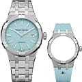 Швейцарские часы Maurice Lacroix Aikon Automatic AI6008-SS00F-431-C, воплощающие современный стиль и безупречное швейцарское качество. Корпус из нержавеющей стали диаметром 42 мм и высотой 11 мм совмещает матовую и полированную отделку, придавая часам изысканный вид. Сапфировое стеклоСапфировое стеклоПрочный и надёжный материал из кристалла сапфира синтетического происхождения, характеризующийся особой твёрдостью и устойчивостью к царапинам и повреждениям. с двойным антибликовым покрытиемАнтибликовое покрытиеСлой оксида металла в 0,13-0,3 микрон, благодаря которому стекло часов не бликует и не отражает свет. Антибликовое покрытие уменьшает отражение света в 10 раз, обеспечивая отличную читаемость показателей циферблата. надежно защищает гильошированный голубой циферблат с узором Clous de Paris. Часы снабжены задней крышкой с сапфировым стеклом, позволяющим увидеть изысканно декорированный автоматический механизм ML115, обладающий запасом хода в 38 часов. БезельБезельВнешний ободок, закрепляющий стекло. В спортивных часах так называется поворотное кольцо с делениями на циферблате, выполняет роль таймера – замеряет отрезки времени на шкале. Неподвижный безель – элемент декора. Однонаправленно вращающийся безель на дайверских часах позволяет фиксировать моменты погружения и выныривания на поверхность. с узнаваемым дизайном из шести "когтей" и завинчивающаяся заводная головка подчеркивают уверенный характер модели. Часы водонепроницаемы до 20 ATM, что делает их отличным выбором для активного образа жизни. Стрелки с люминесцентным покрытиемЛюминесцентное покрытиеПозволяет считывать показания времени в темноте. Производители наносят на стрелки, часовые индексы, безель или поверхность циферблата светонакопительный состав, дающий холодное свечение., что облегчает чтение времени даже в условиях слабого освещения. На 3 часах расположено окошко с датой, добавляющее функциональности. Часы комплектуются браслетом из нержавеющей стали, и застежка «бабочка»Застёжка "бабочка"Такой вид застёжки дополняется предохранителями, помогающими избежать случайного раскрытия браслета. Обладают изящным исполнением. , раскладывающаяся при нажатии кнопок двойной блокировки и гравировкой Maurice Lacroix завершают образ, обеспечивая удобство и стиль. Особенность этой модели - дополнительный резиновый ремешок голубого цвета со стандартной застежкой.