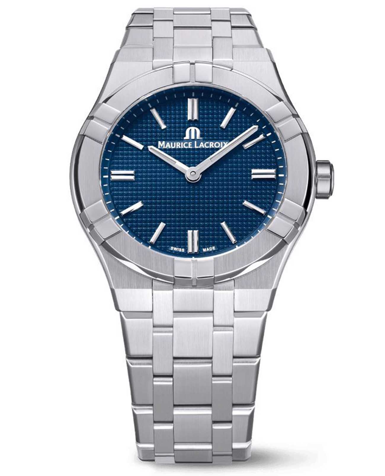 Maurice Lacroix AIKON Manual 39mm Collectors Edition AI7007-SS00E-430-C — лимитированная модель на 500 экземпляров, объединяющая архитектурную строгость дизайна AIKON и традиции классического ручного завода. Корпус диаметром 39 мм выполнен из нержавеющей стали с полированной и сатинированной отделкой, характерной для коллекции AIKON. Циферблат защищён сапфировым стекломСапфировое стеклоПрочный и надёжный материал из кристалла сапфира синтетического происхождения, характеризующийся особой твёрдостью и устойчивостью к царапинам и повреждениям. с двойным антибликовым покрытиемАнтибликовое покрытиеСлой оксида металла в 0,13-0,3 микрон, благодаря которому стекло часов не бликует и не отражает свет. Антибликовое покрытие уменьшает отражение света в 10 раз, обеспечивая отличную читаемость показателей циферблата., обеспечивающим чёткую читаемость в любых условиях. Синий циферблат с гильошированным узором Clous de Paris украшен накладными индексами и стрелками с люминесцентным покрытиемЛюминесцентное покрытиеПозволяет считывать показания времени в темноте. Производители наносят на стрелки, часовые индексы, безель или поверхность циферблата светонакопительный состав, дающий холодное свечение.. Окно даты расположено на позиции «6 часов». Внутри установлен мануфактурный калибр ML145 с ручным заводом, 18 камнями и частотой 28 800 пк/ч. Запас хода составляет до 42 часов. Прозрачная задняя крышка демонстрирует отделку механизма и гравировку с индивидуальным номером модели. Браслет из нержавеющей стали снабжён системой быстрой замены и застёжкой «бабочка» с кнопкамиЗастёжка "бабочка"Такой вид застёжки дополняется предохранителями, помогающими избежать случайного раскрытия браслета. Обладают изящным исполнением. , что повышает комфорт и универсальность ношения, в комплекте идет так же ремешок на стандартной застежке. Водонепроницаемость 100 метров делает AIKON Manual надёжным спутником в повседневной жизни. Эта лимитированная версия — настоящий подарок для ценителей ручной механики и чистоты формы.