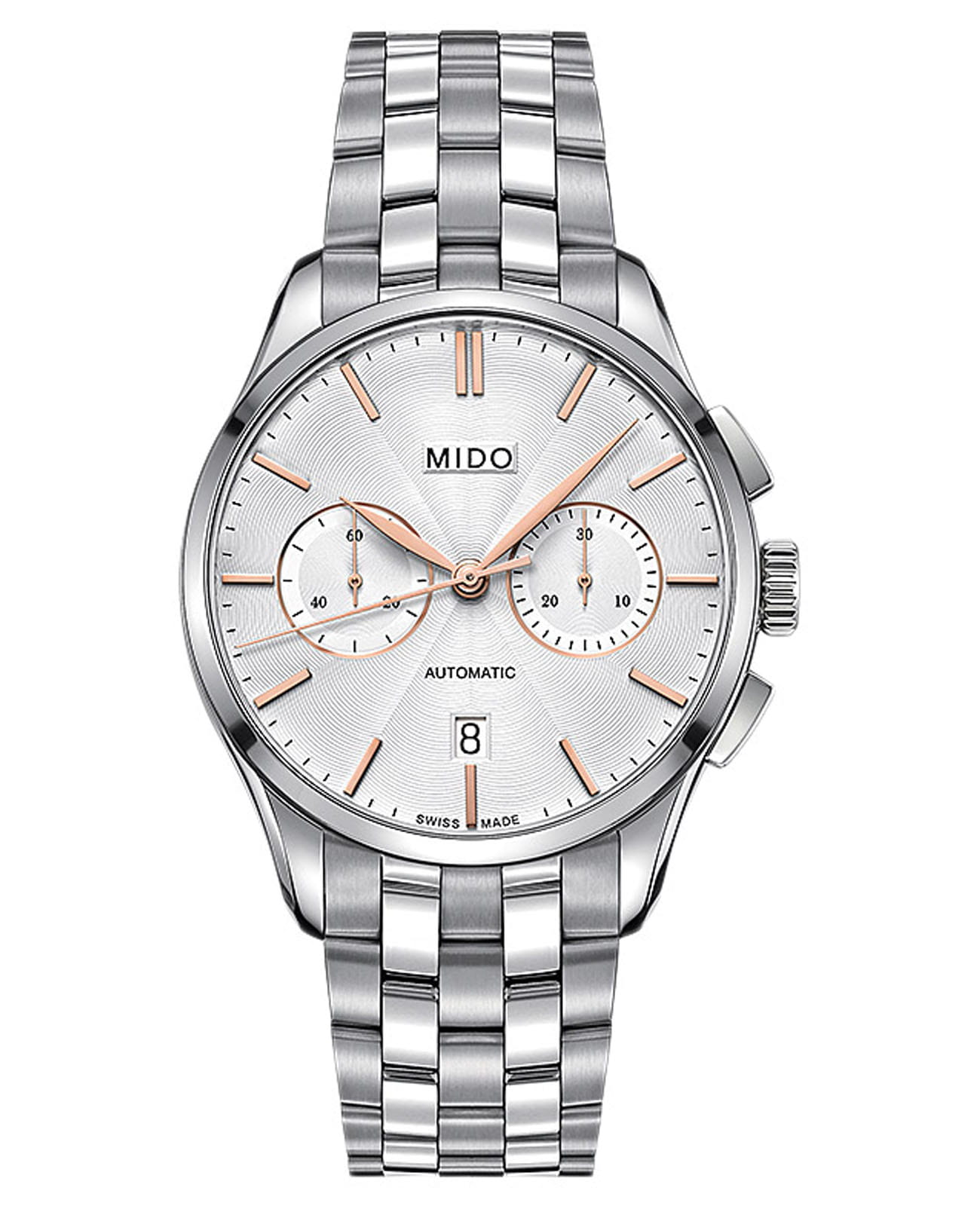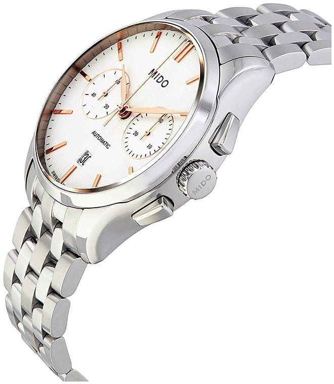 Мужские швейцарские механические часы-хронографХронографФункция позволяет измерять отрезки времени с особой точностью: часы, минуты, секунды. Верным признаком хронографа является наличие на циферблате 3 дополнительных окошек-счётчиков. Mido Belluna Sunray M024.427.11.031.00, оснащенные механизмом Caliber 60 часы Belluna Chronograph со стрелками и часовыми метками с PVD-покрытиемPVDУльтратонкое покрытие наносится в технике вакуумного напыления, сочетает в себе нитрид титана особой прочности со слоем золота или оксида хрома. Несёт в себе декоративную или защитную функцию. цвета розового золота, прямоугольными кнопками. Посредством исключительно сложной технологии, на компоненты часов наносится PVDPVDУльтратонкое покрытие наносится в технике вакуумного напыления, сочетает в себе нитрид титана особой прочности со слоем золота или оксида хрома. Несёт в себе декоративную или защитную функцию. покрытие, которое обеспечивает длительную защиту металла от коррозии.