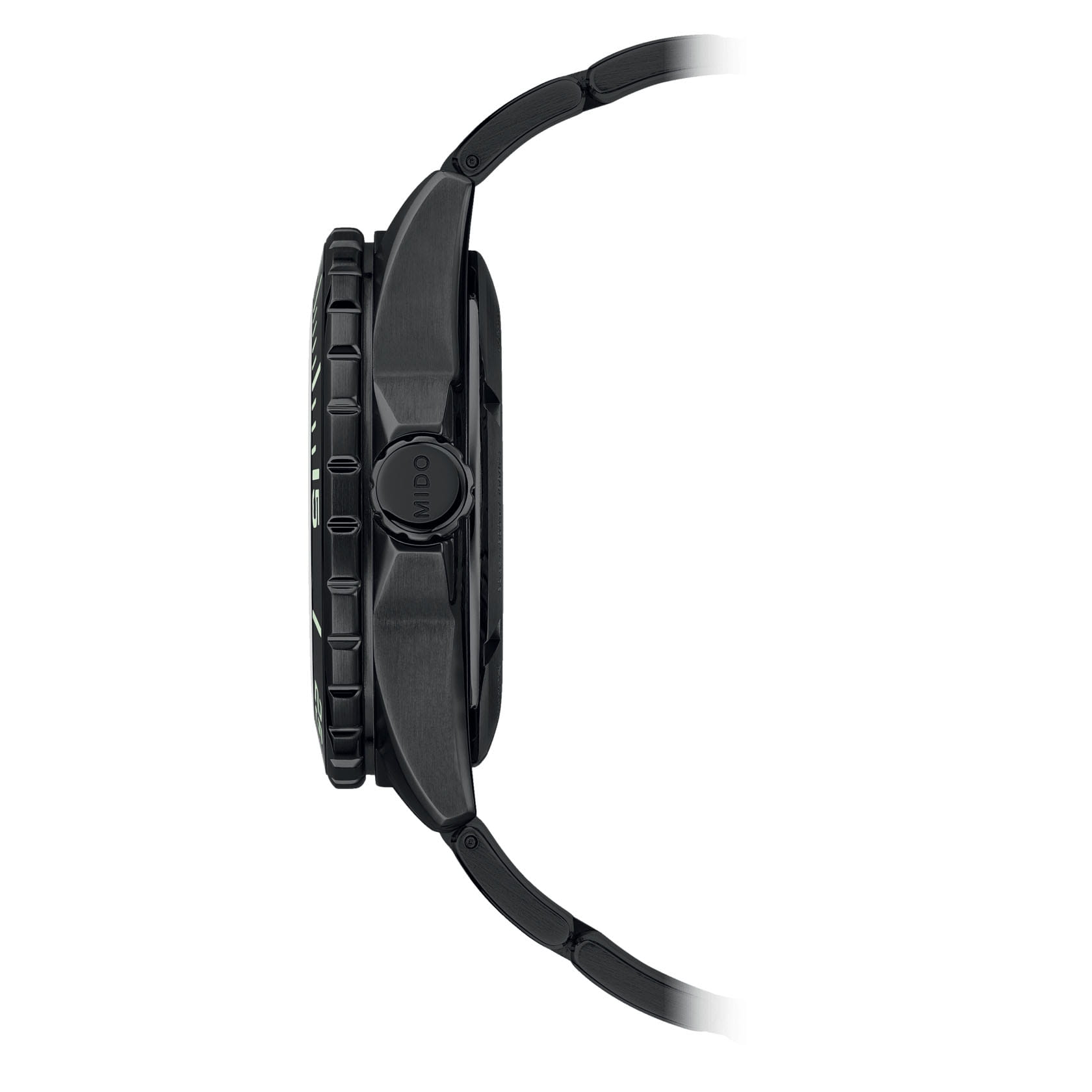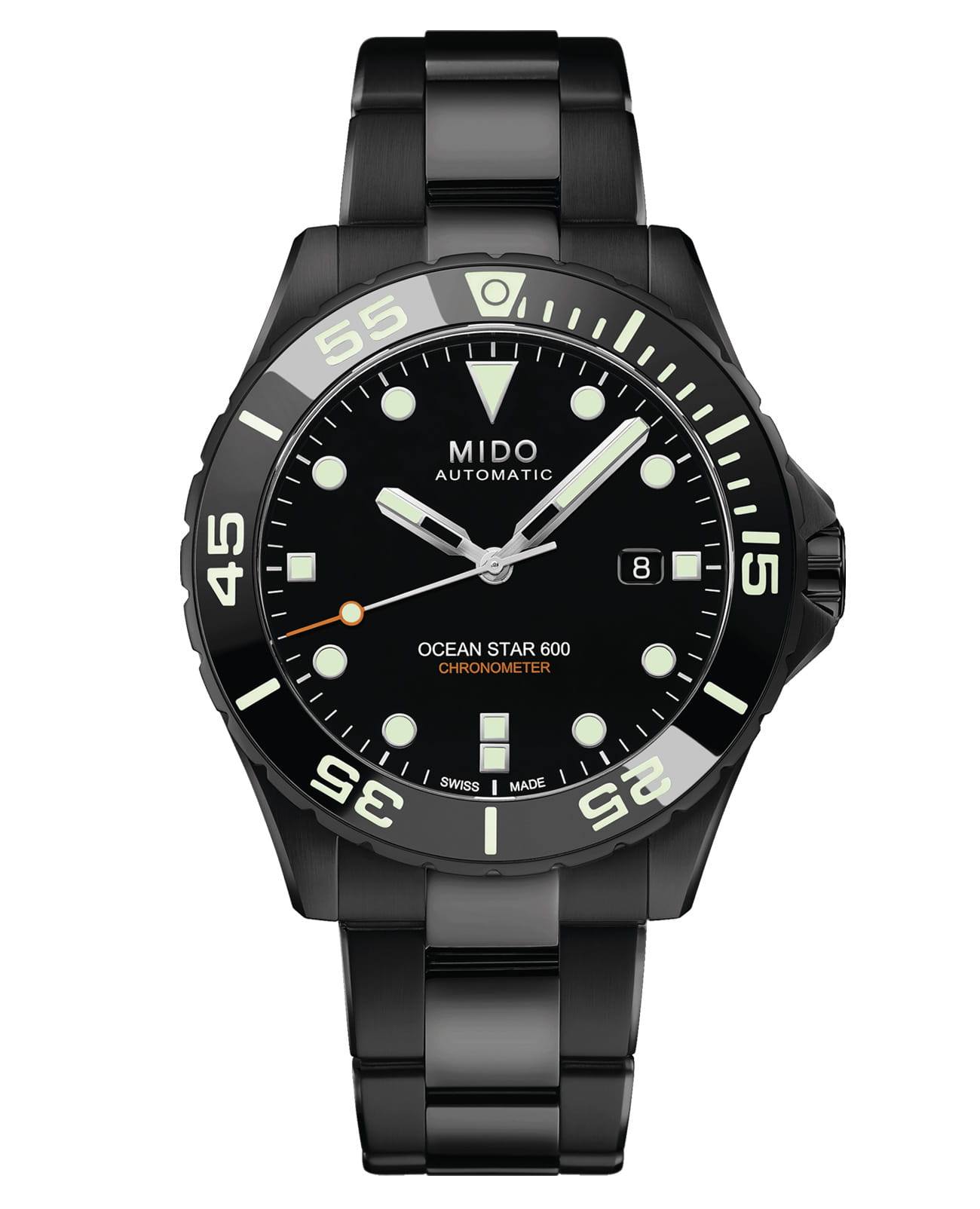 Часы MIDO Ocean Star 600 Chronometer (артикул M026.608.33.051.00) — это высокотехнологичная модель, созданная для исследования океанских глубин. Корпус диаметром 43,5 мм выполнен из нержавеющей стали с чёрным DLC-покрытиемDLC-покрытиеDiamond like carbon - одно из лучших видов покрытия, представляющее собой углерод с алмазными свойствами. На поверхность материала наносятся распавшиеся молекулы углерода, превращающиеся в плёнку из алмазоподобных связей, которая перенимает твёрдость алмаза. и керамическим безелем, заполненным люминесцентным составом Super-LumiNova® Grade XЛюминесцентное покрытиеПозволяет считывать показания времени в темноте. Производители наносят на стрелки, часовые индексы, безель или поверхность циферблата светонакопительный состав, дающий холодное свечение.. Водозащита до 60 бар (600 метров), гелиевый клапан обеспечивают функциональность для глубоководных погружений. Чёрный циферблат с накладными часовыми метками, покрытыми Super-LumiNova®Люминесцентное покрытиеПозволяет считывать показания времени в темноте. Производители наносят на стрелки, часовые индексы, безель или поверхность циферблата светонакопительный состав, дающий холодное свечение., защищён сапфировым стекломСапфировое стеклоПрочный и надёжный материал из кристалла сапфира синтетического происхождения, характеризующийся особой твёрдостью и устойчивостью к царапинам и повреждениям. с двусторонним антибликовым покрытием.