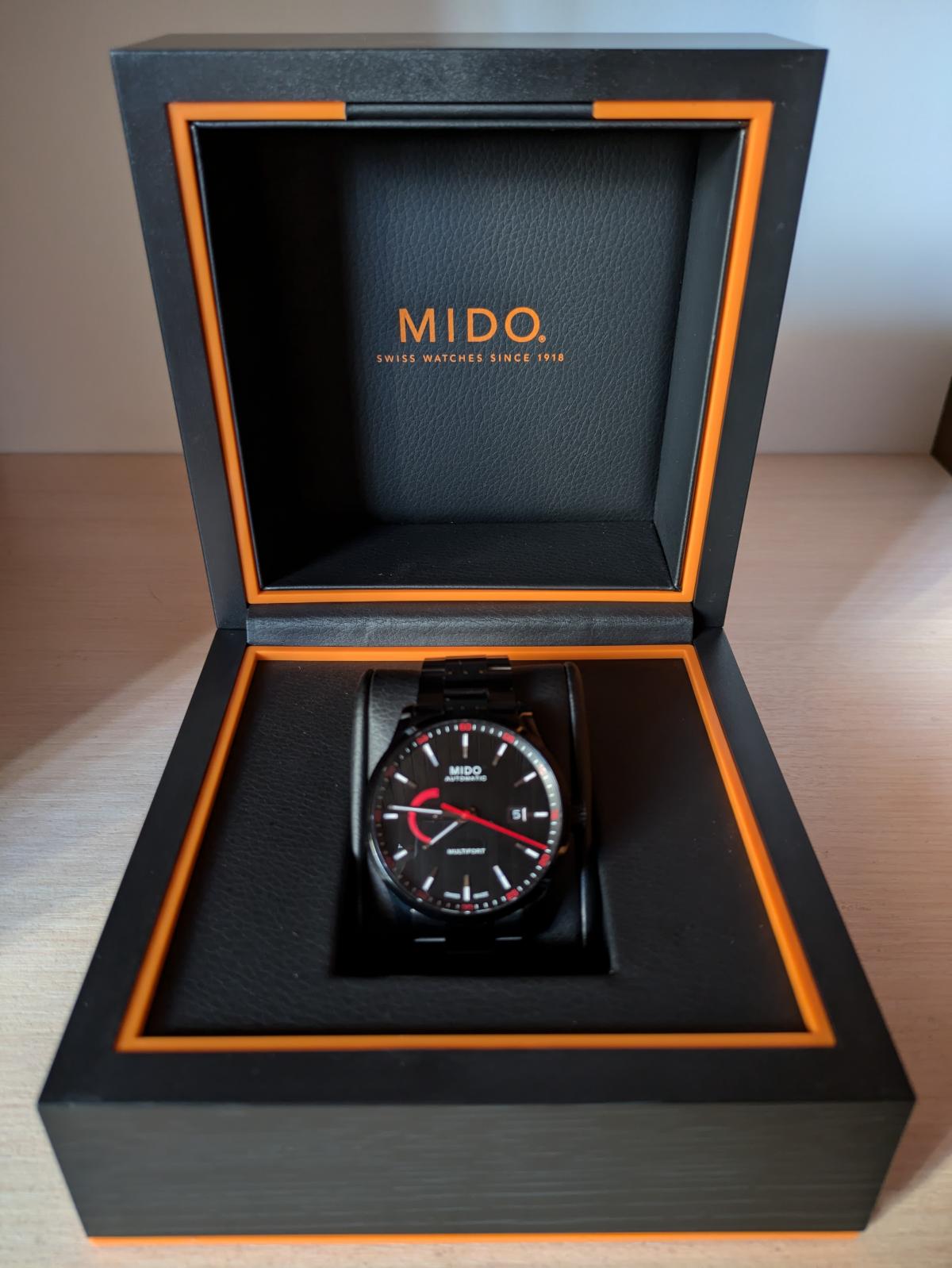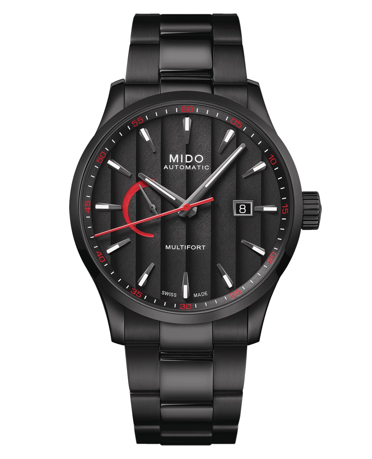 Часы MIDO Multifort Power Reserve (артикул M038.424.33.051.00) сочетают в себе спортивный и городской дизайн, подчёркивая надёжность и элегантность. Корпус диаметром 42 мм выполнен из нержавеющей стали с чёрным PVD-покрытиемPVDУльтратонкое покрытие наносится в технике вакуумного напыления, сочетает в себе нитрид титана особой прочности со слоем золота или оксида хрома. Несёт в себе декоративную или защитную функцию. и водозащитой до 10 бар (100 метров). Прозрачная задняя крышка подчёркивает изысканный механизм. Чёрный циферблат с узором «Côtes de Genève» и накладными часовыми метками оснащён покрытием Super-LumiNova®Люминесцентное покрытиеПозволяет считывать показания времени в темноте. Производители наносят на стрелки, часовые индексы, безель или поверхность циферблата светонакопительный состав, дающий холодное свечение. для отличной читаемости. Индикатор запаса хода расположен в положении «9 часов», а окошко даты — в положении «3 часа». Циферблат защищён сапфировым стекломСапфировое стеклоПрочный и надёжный материал из кристалла сапфира синтетического происхождения, характеризующийся особой твёрдостью и устойчивостью к царапинам и повреждениям. с антибликовым покрытием.