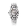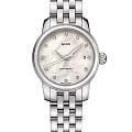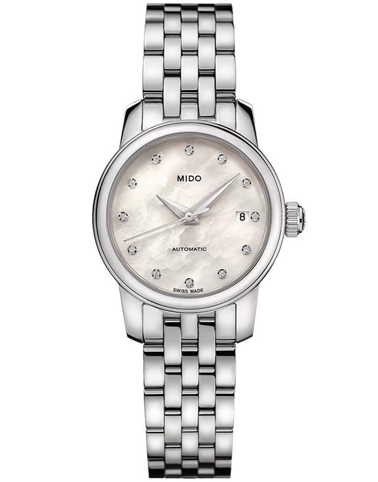 Mido Baroncelli Lady Twenty Five M039.007.11.106.00  — утончённые женские часы, созданные для тех, кто ценит изящество и швейцарскую точность. Корпус диаметром 25 мм выполнен из полированной нержавеющей стали и гармонично сочетается с пятизвенным браслетом, дополненным раскладной застёжкойРаскладная застёжкаТакой тип застёжки используется только на браслетах из металла. Она никогда не раскрывается полностью, происходит разделение на 2 и более частей. Раскладывающая застёжка снизит вероятность потери часов к минимуму.. Циферблат из натурального перламутра украшен двенадцатью бриллиантами-часовыми метками, создающими игру света и подчеркивающими утончённый характер модели. Защиту обеспечивает сапфировое стеклоСапфировое стеклоПрочный и надёжный материал из кристалла сапфира синтетического происхождения, характеризующийся особой твёрдостью и устойчивостью к царапинам и повреждениям. с надёжным антибликовым покрытиемАнтибликовое покрытиеСлой оксида металла в 0,13-0,3 микрон, благодаря которому стекло часов не бликует и не отражает свет. Антибликовое покрытие уменьшает отражение света в 10 раз, обеспечивая отличную читаемость показателей циферблата., что гарантирует отличную читаемость в любых условиях. Прозрачная задняя крышка открывает вид на тщательно декорированный ротор, что придаёт часам дополнительное очарование. Водозащита до 50 метров делает модель практичной для повседневного ношения, сохраняя при этом её ювелирную элегантность.