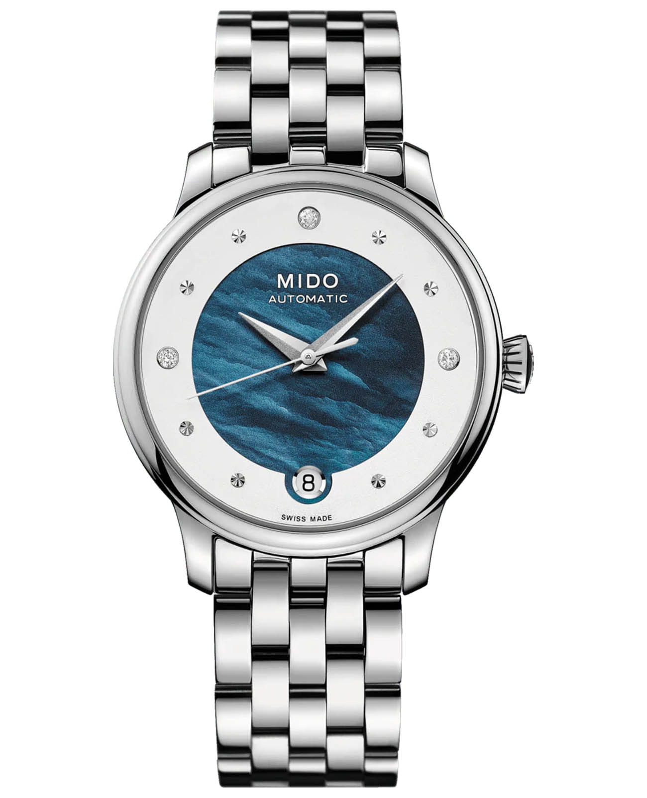 Женские швейцарские механические часы с бриллиантами Mido Baroncelli Lady Day M039.207.11.106.01, механический механизм (автоматический калибр) с высокой точностью. Сапфировое стекло устойчивое к появлению царапин, обладающее высокой прозрачностью. Класс водозащиты: 50 метров, позволит защитить корпус от случайных брызг или капель дождя. Корпус часов изготовлен из стали, серебристого цвета. Baroncelli Lady Day – в высшей степени женственные швейцарские часы, вдохновленные дизайном исторической модели. Гармоничные линии, перламутровый циферблат и бриллиантовая отделка превращают их в аксессуар, идеально завершающий дневной или вечерний образ.