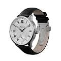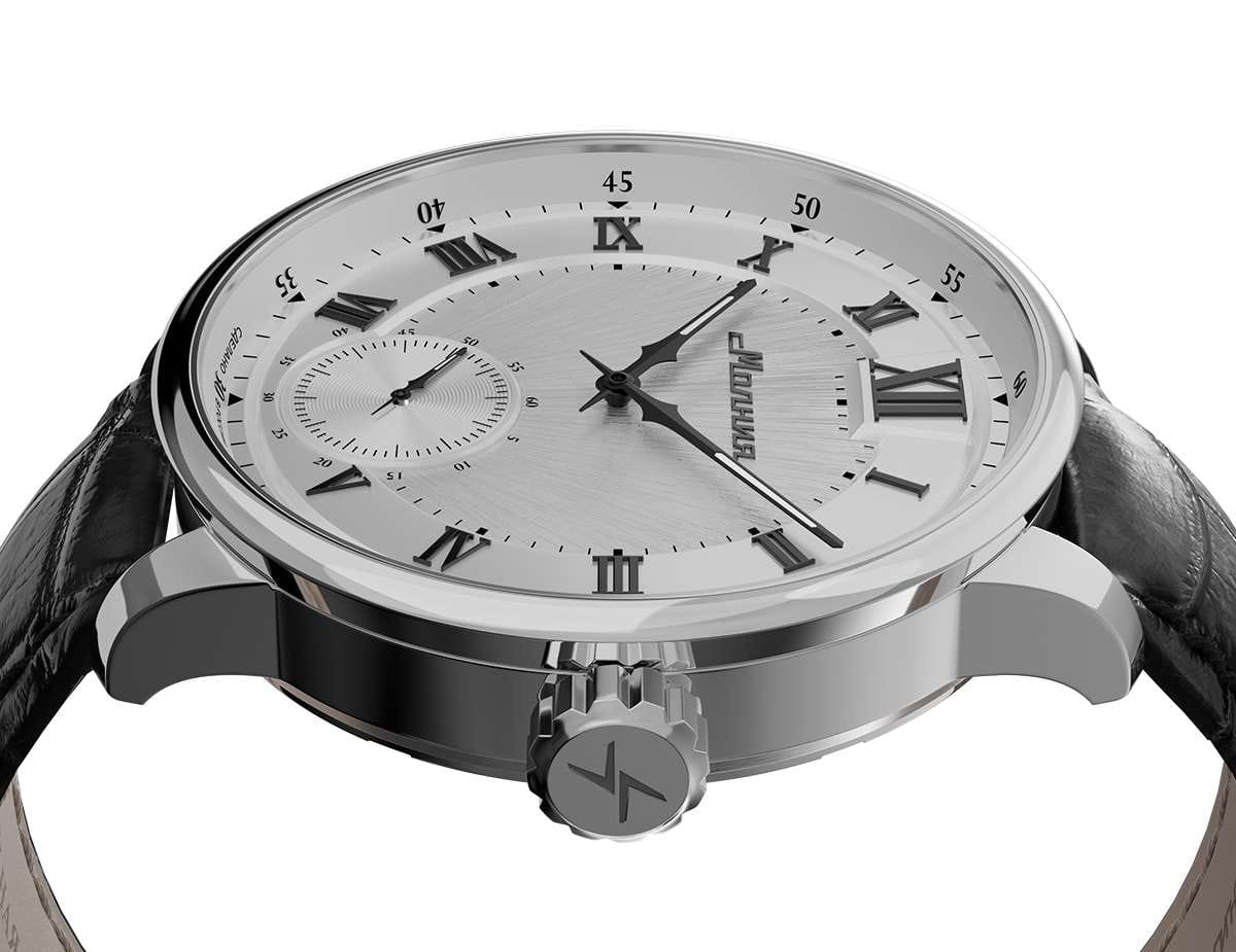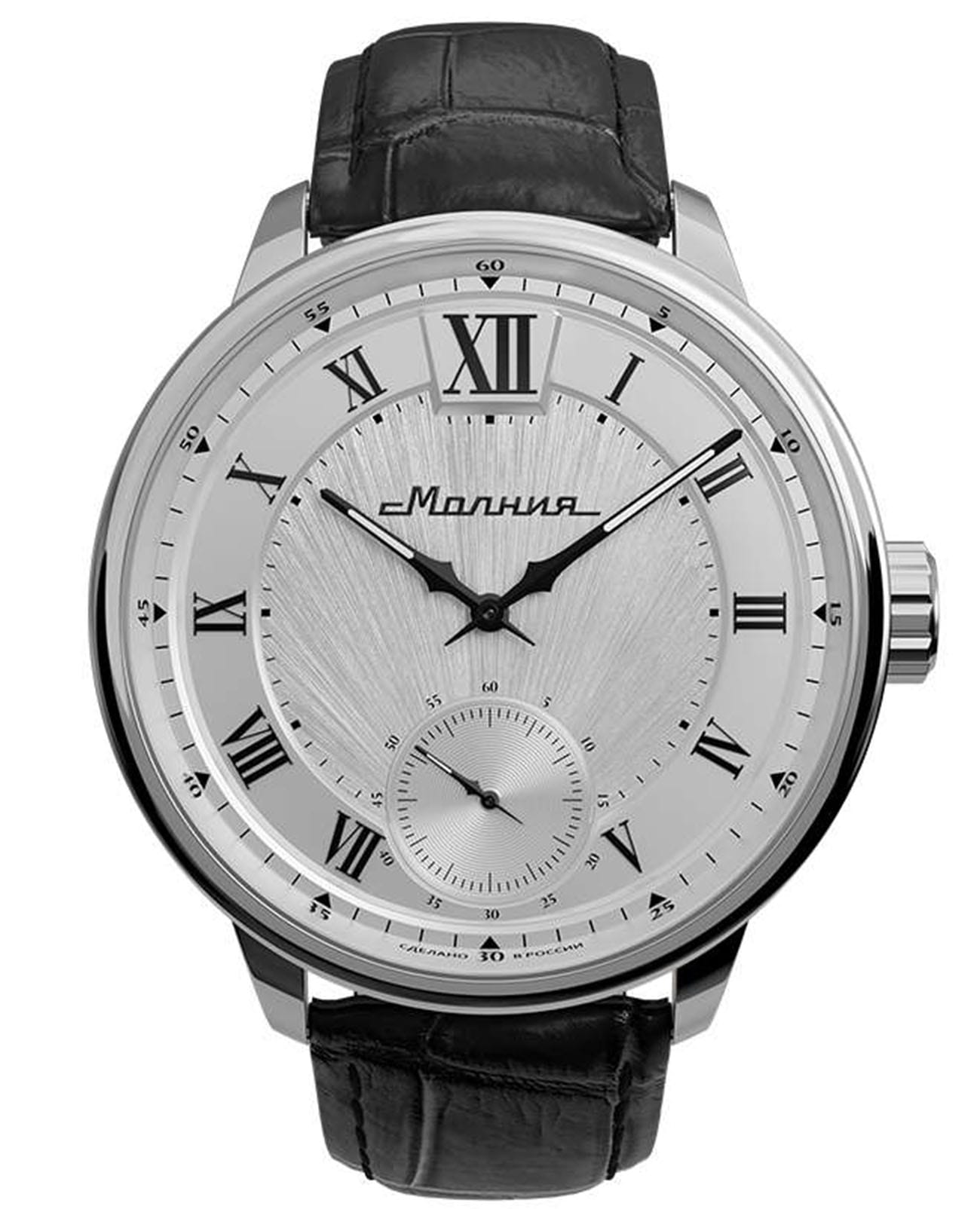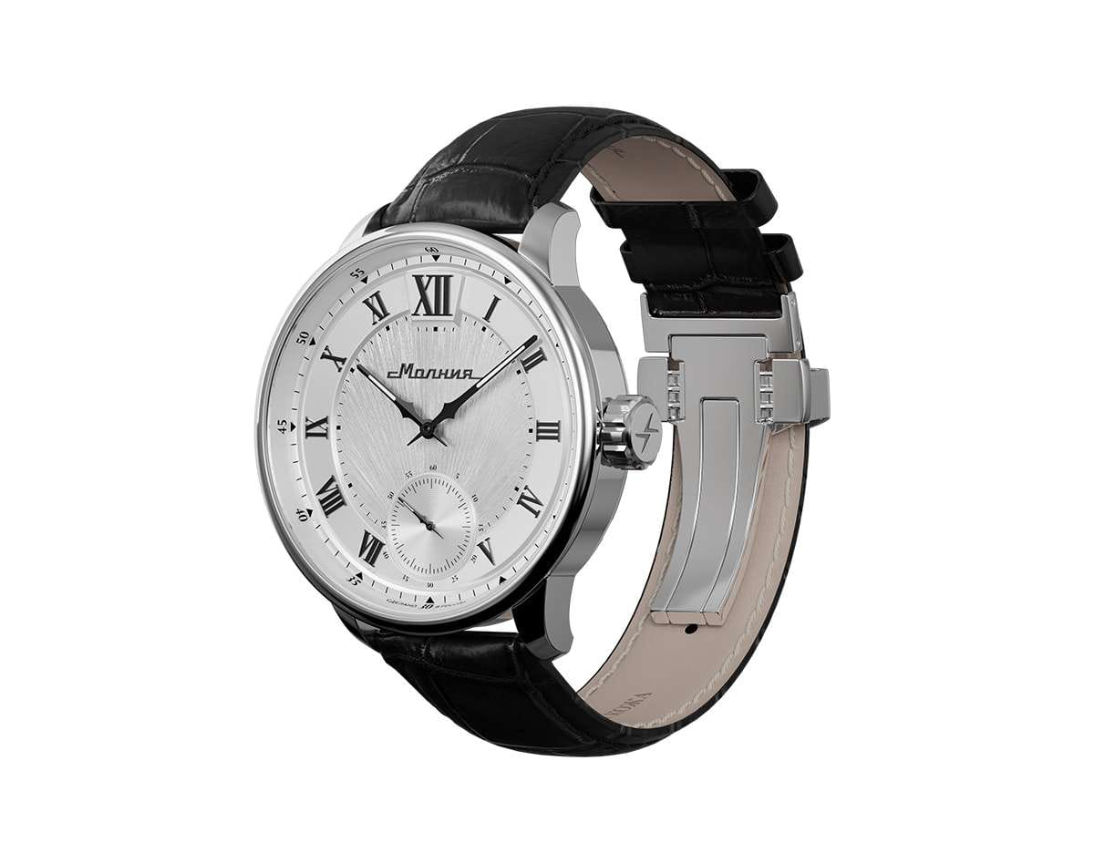 Мужские механические часы с ручным подзаводом — это аксессуар от легендарного бренда «МОЛНИЯ», созданный на Челябинском часовом заводе. Корпус диаметром 41 мм и толщиной 12 мм выполнен из нержавеющей стали 316L с зеркальной полировкой. БезельБезельВнешний ободок, закрепляющий стекло. В спортивных часах так называется поворотное кольцо с делениями на циферблате, выполняет роль таймера – замеряет отрезки времени на шкале. Неподвижный безель – элемент декора. Однонаправленно вращающийся безель на дайверских часах позволяет фиксировать моменты погружения и выныривания на поверхность. также выполнен из стали с зеркальной отделкой. Циферблат белого цвета оформлен римскими цифрами и стальными индексами. Малая секундная стрелка вынесена на позицию 6 часов. Циферблат защищён сапфировым стекломСапфировое стеклоПрочный и надёжный материал из кристалла сапфира синтетического происхождения, характеризующийся особой твёрдостью и устойчивостью к царапинам и повреждениям. толщиной 2,5 мм. Механизм — мануфактурный калибр 3603, собранный вручную, с запасом хода до 40 часов. Прозрачная задняя крышка позволяет наблюдать за работой механизма. Часы оснащены чёрным кожаным ремешком шириной 20 мм с раскладной застёжкойРаскладная застёжкаТакой тип застёжки используется только на браслетах из металла. Она никогда не раскрывается полностью, происходит разделение на 2 и более частей. Раскладывающая застёжка снизит вероятность потери часов к минимуму. и системой быстрой замены. Водонепроницаемость 100 м позволяет использовать часы для плавания и повседневного ношения. Идеальный выбор для тех, кто ценит российское качество и традиции.