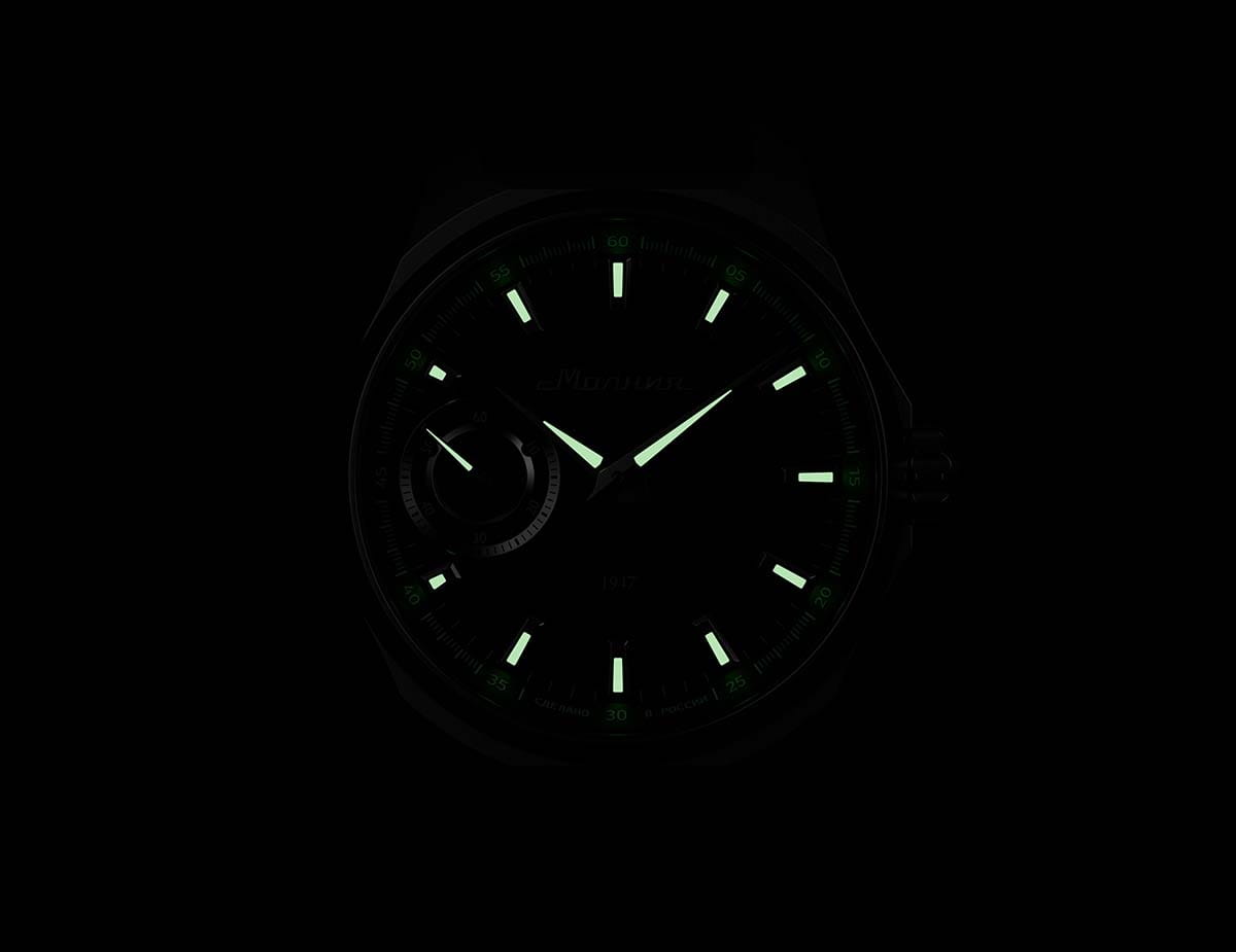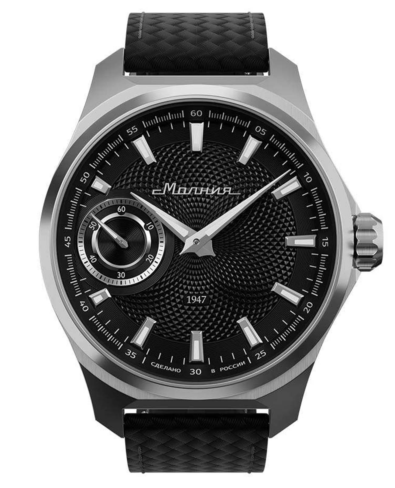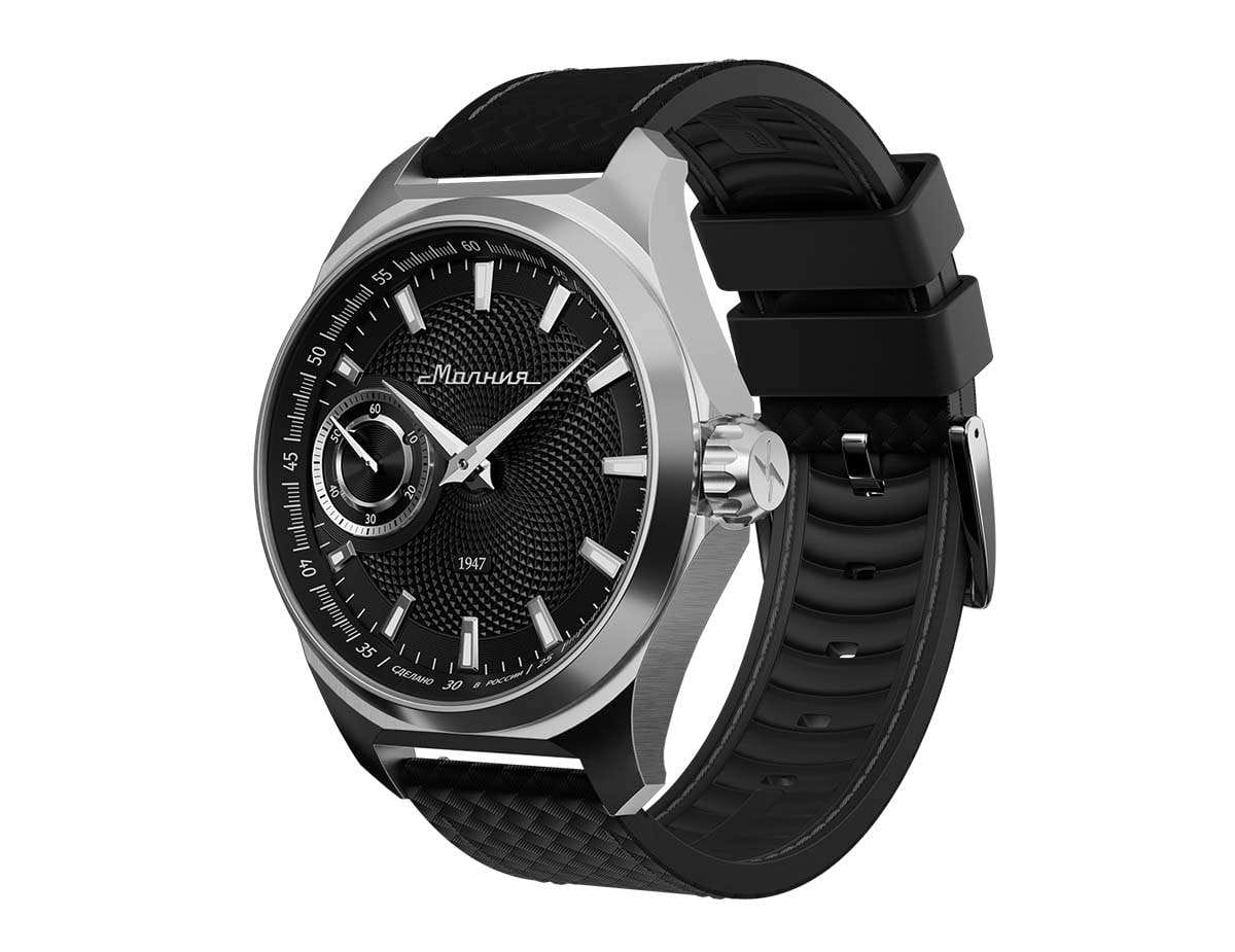Мужские механические часы с ручным подзаводом — это аксессуар от легендарного бренда «МОЛНИЯ», созданный на Челябинском часовом заводе. Корпус диаметром 42 мм выполнен из нержавеющей стали 316L с зеркальной полировкой. БезельБезельВнешний ободок, закрепляющий стекло. В спортивных часах так называется поворотное кольцо с делениями на циферблате, выполняет роль таймера – замеряет отрезки времени на шкале. Неподвижный безель – элемент декора. Однонаправленно вращающийся безель на дайверских часах позволяет фиксировать моменты погружения и выныривания на поверхность. также выполнен из стали с зеркальной отделкой. Циферблат чёрного цвета оформлен индексами и стрелками. Малая секундная стрелка вынесена на позицию 9 часов. Стрелки и метки с люминесцентным покрытиемЛюминесцентное покрытиеПозволяет считывать показания времени в темноте. Производители наносят на стрелки, часовые индексы, безель или поверхность циферблата светонакопительный состав, дающий холодное свечение. Super-LumiNova, обеспечивающим хорошую читаемость в темноте. Циферблат защищён сапфировым стекломСапфировое стеклоПрочный и надёжный материал из кристалла сапфира синтетического происхождения, характеризующийся особой твёрдостью и устойчивостью к царапинам и повреждениям. с антибликовым покрытиемАнтибликовое покрытиеСлой оксида металла в 0,13-0,3 микрон, благодаря которому стекло часов не бликует и не отражает свет. Антибликовое покрытие уменьшает отражение света в 10 раз, обеспечивая отличную читаемость показателей циферблата.. Механизм — мануфактурный калибр 3603, собранный вручную, с запасом хода до 40 часов. Прозрачная задняя крышка позволяет наблюдать за работой механизма. Часы оснащены силиконовым ремешком чёрного цвета с классической пряжкой, а также системой быстрой замены. Водонепроницаемость 100 м позволяет использовать часы для плавания и повседневного ношения. Идеальный выбор для тех, кто ценит российское качество и традиции.