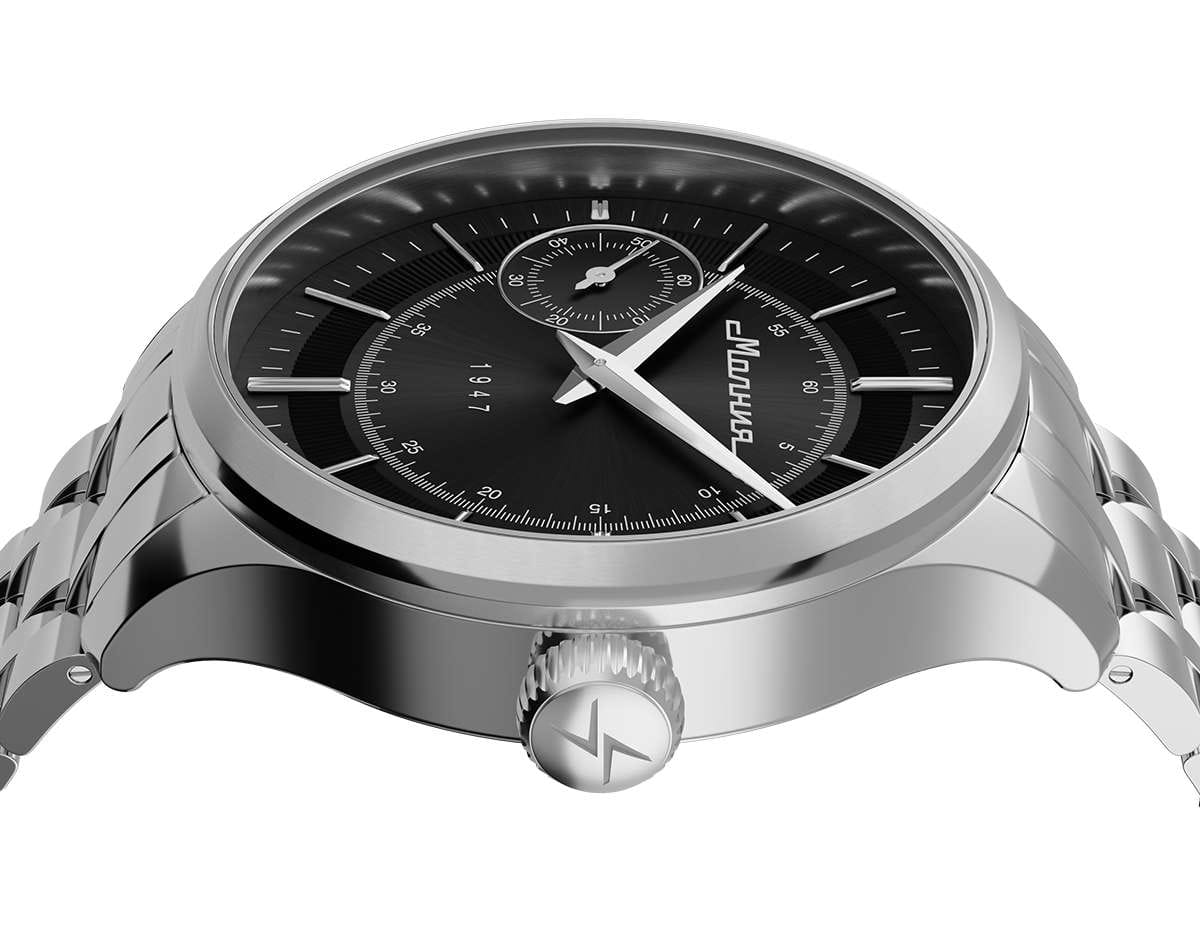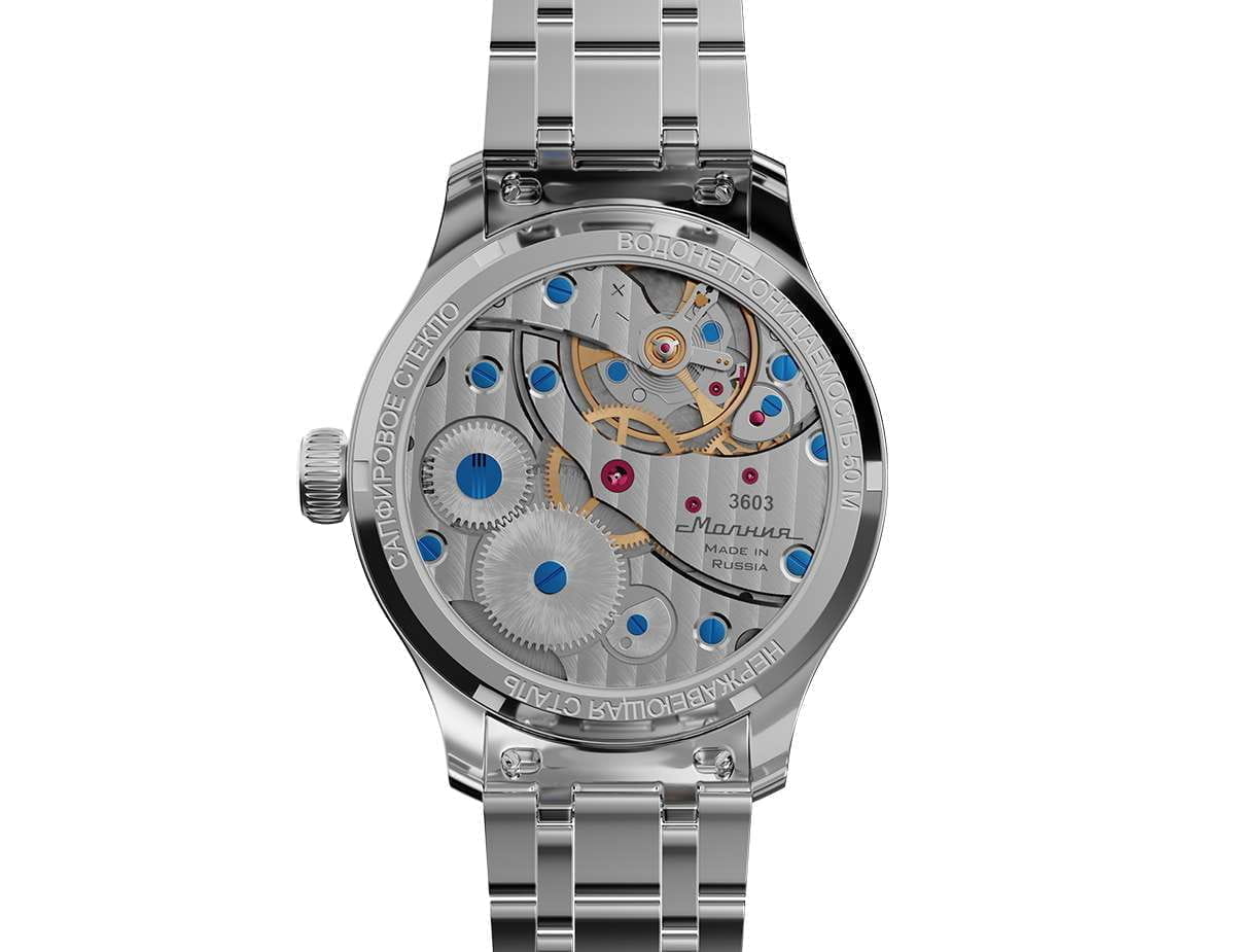 Мужские механические часы с ручным подзаводом — это аксессуар от легендарного бренда «МОЛНИЯ», созданный на Челябинском часовом заводе. Корпус диаметром 41 мм выполнен из нержавеющей стали 316L с зеркальной полировкой. БезельБезельВнешний ободок, закрепляющий стекло. В спортивных часах так называется поворотное кольцо с делениями на циферблате, выполняет роль таймера – замеряет отрезки времени на шкале. Неподвижный безель – элемент декора. Однонаправленно вращающийся безель на дайверских часах позволяет фиксировать моменты погружения и выныривания на поверхность. также выполнен из стали с зеркальной отделкой. Циферблат чёрного цвета оформлен индексами и стрелками. Малая секундная стрелка вынесена на позицию 9 часов. Циферблат защищён сапфировым стекломСапфировое стеклоПрочный и надёжный материал из кристалла сапфира синтетического происхождения, характеризующийся особой твёрдостью и устойчивостью к царапинам и повреждениям. толщиной 2 мм. Механизм — мануфактурный калибр 3603, собранный вручную, с запасом хода до 40 часов. Прозрачная задняя крышка позволяет наблюдать за работой механизма. Часы оснащены стальным браслетом с раскладной застёжкойРаскладная застёжкаТакой тип застёжки используется только на браслетах из металла. Она никогда не раскрывается полностью, происходит разделение на 2 и более частей. Раскладывающая застёжка снизит вероятность потери часов к минимуму. с кнопочным открытием и системой быстрой замены. Водонепроницаемость 50 м позволяет использовать часы в повседневных условиях. Идеальный выбор для тех, кто ценит российское качество и традиции.