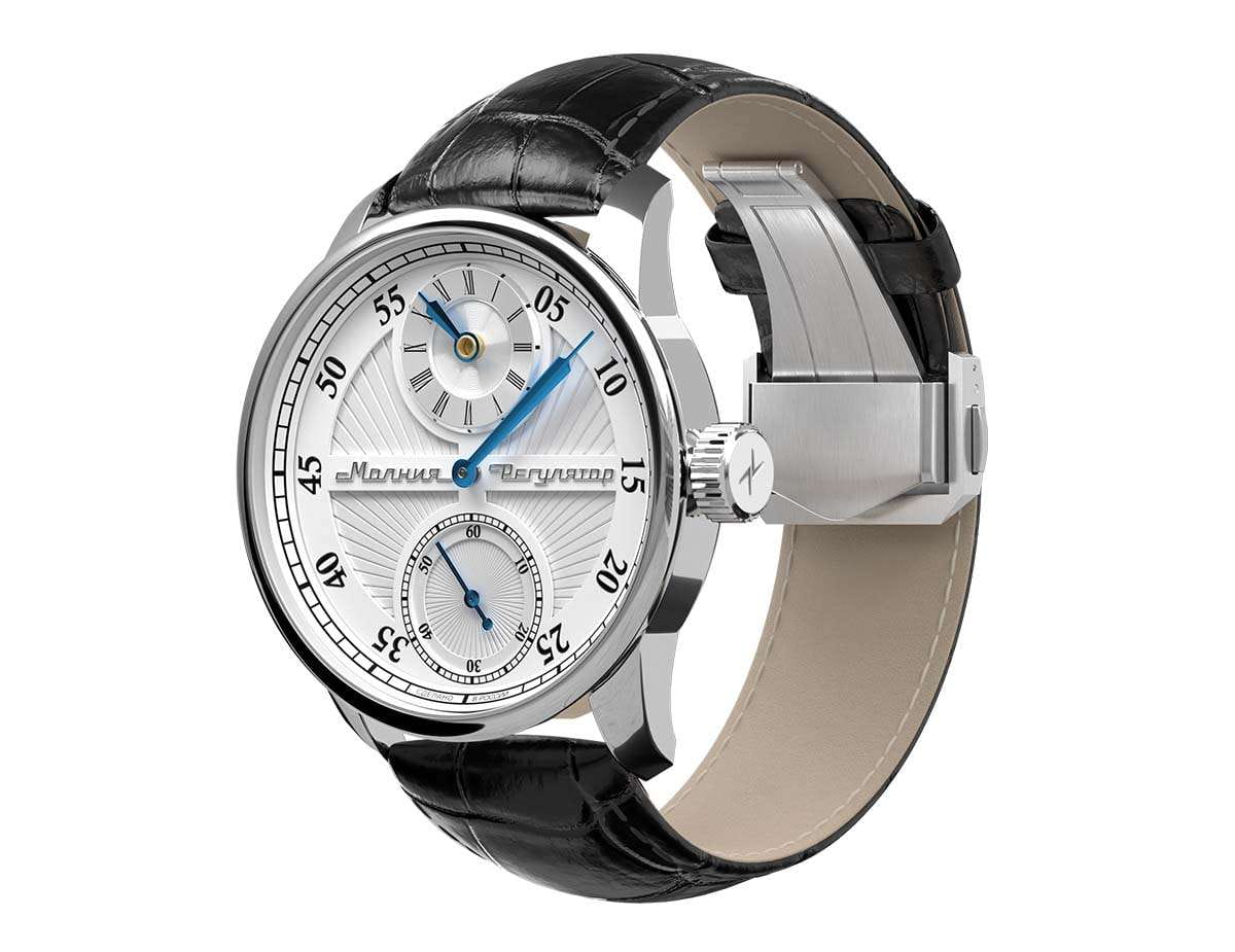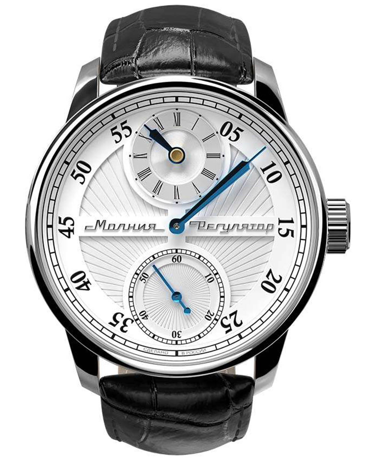 Мужские механические часы с ручным подзаводом — это аксессуар от легендарного бренда «МОЛНИЯ», созданный на Челябинском часовом заводе. Корпус диаметром 42 мм выполнен из нержавеющей стали. Циферблат оформлен индексами и стрелками. Малая секундная стрелка вынесена на отдельный субциферблат. Циферблат защищён сапфировым стекломСапфировое стеклоПрочный и надёжный материал из кристалла сапфира синтетического происхождения, характеризующийся особой твёрдостью и устойчивостью к царапинам и повреждениям.. Механизм — мануфактурный калибр 3603RS, полностью собранный вручную, с декорированными деталями, которые видны через прозрачную заднюю крышку. Часы оснащены кожаным ремешком чёрного цвета с раскладной застёжкойРаскладная застёжкаТакой тип застёжки используется только на браслетах из металла. Она никогда не раскрывается полностью, происходит разделение на 2 и более частей. Раскладывающая застёжка снизит вероятность потери часов к минимуму.. Водонепроницаемость 100 м позволяет использовать часы для плавания и повседневного ношения. Идеальный выбор для тех, кто ценит российское качество и традиции.