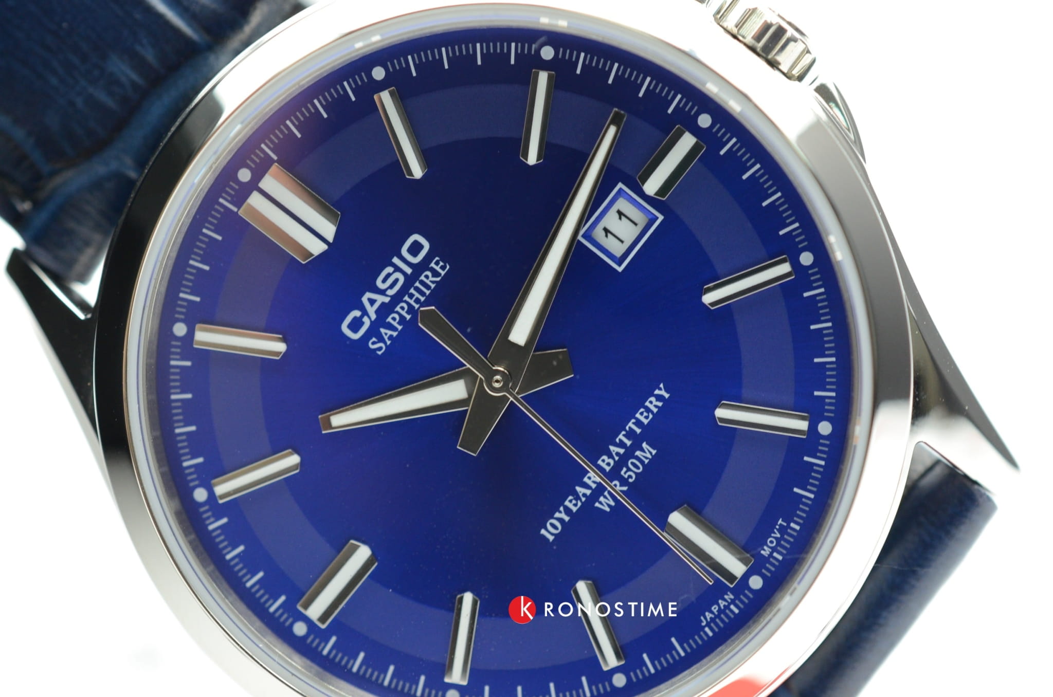 Наручные часы ярко-синего цвета идеальны для ежедневной носки, классический стиль делает их универсальной моделью. Главная особенность заключается в продолжительном сроке службы батарейки, питающей кварцевый механизм - аккумулятор рассчитан на 10 лет эксплуатации. Корпус сделан из хирургической стали 316L, материал устойчив к коррозии. Сапфировое стекло невозможно поцарапать. Люминесцентная подсветкаЛюминесцентное покрытиеПозволяет считывать показания времени в темноте. Производители наносят на стрелки, часовые индексы, безель или поверхность циферблата светонакопительный состав, дающий холодное свечение.. Водонепроницаемость 5 бар. Ремешок из натуральной кожи. Окошко текущего числа. Габариты: 47 x 41,3 x 8,8 мм.