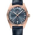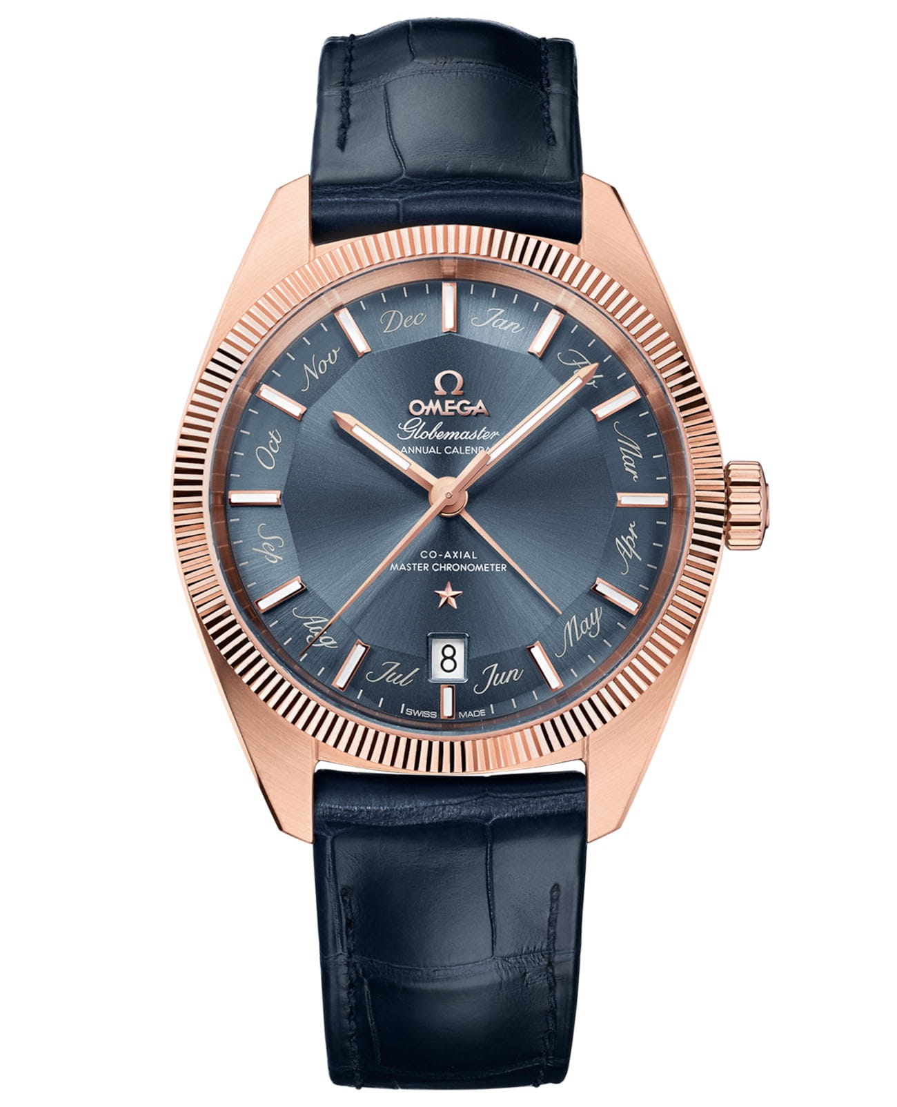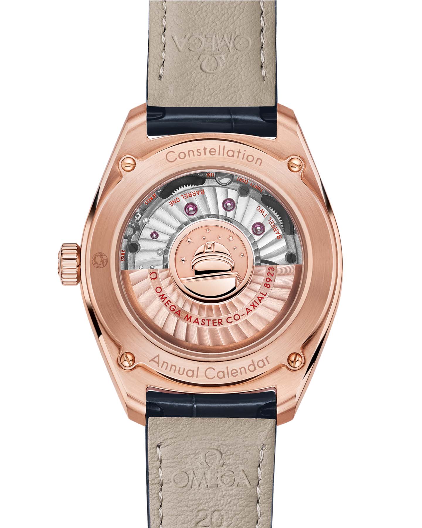 Sedna™, помещенный в устойчивое к царапинам сапфировое стеклоСапфировое стеклоПрочный и надёжный материал из кристалла сапфира синтетического происхождения, характеризующийся особой твёрдостью и устойчивостью к царапинам и повреждениям.. Синий циферблат Pie Pan с солнечной матовой поверхностью напоминает о первой модели Constellation 1952 года. Каждая из его граней включает месяц года в соответствии с функцией годового календаряВечный календарьКлассическое часовое усложнение, представляющее собой календарь, рассчитанный на несколько лет вперёд (стандартно – до 2099 года). Определяет текущую дату, день недели, месяц.. Звезда Constellation и логотип OMEGA выполнены из золота 18K18-каратное золотоОбозначение по каратной системе пробирования, оно показывает, сколько драгоценного металла содержится в изделии. 18 карат - в составе 75% чистого золота, соответствует 750 пробе.