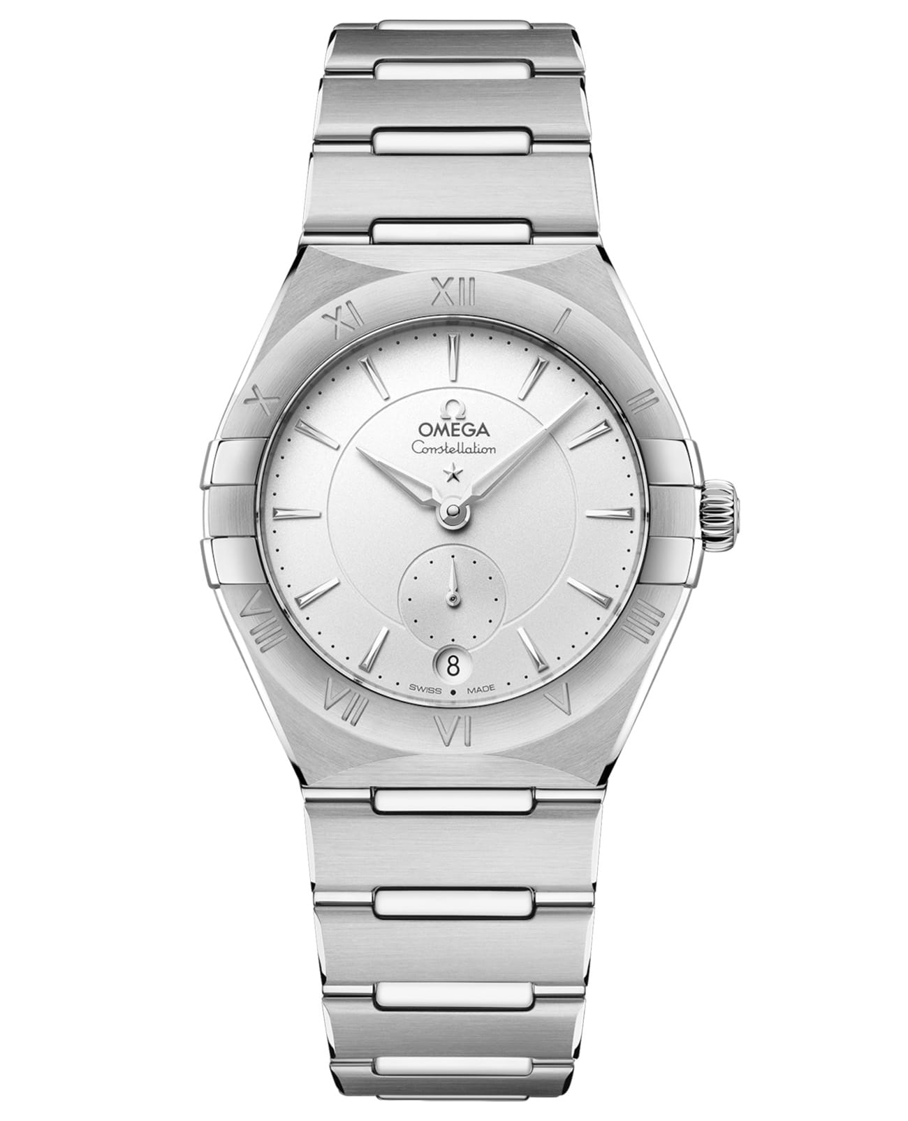 Драматичный и неизменный дизайн часов OMEGA Constellation характеризуется знаменитыми гранями в виде полумесяца, а также «скобами» на боковых сторонах корпуса. Эта 34-миллиметровая модель из нержавеющей стали оснащена безелемБезельВнешний ободок, закрепляющий стекло. В спортивных часах так называется поворотное кольцо с делениями на циферблате, выполняет роль таймера – замеряет отрезки времени на шкале. Неподвижный безель – элемент декора. Однонаправленно вращающийся безель на дайверских часах позволяет фиксировать моменты погружения и выныривания на поверхность. с выгравированными римскими цифрами, кристально белым серебристым циферблатом и круглым окошком даты в положении «6 часов». Полированные часовые индексы, стрелки, логотип OMEGA и звезда Constellation выполнены из белого золота 18 карат18-каратное золотоОбозначение по каратной системе пробирования, оно показывает, сколько драгоценного металла содержится в изделии. 18 карат - в составе 75% чистого золота, соответствует 750 пробе.