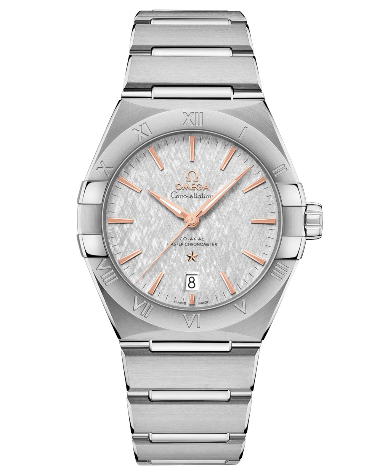 Драматичный и неизменный дизайн OMEGA Constellation характеризуется знаменитыми полумесяцами, «скобами» на корпусе и браслетом-моногранником. Модель из нержавеющей стали диаметром 39 мм оснащена безелемБезельВнешний ободок, закрепляющий стекло. В спортивных часах так называется поворотное кольцо с делениями на циферблате, выполняет роль таймера – замеряет отрезки времени на шкале. Неподвижный безель – элемент декора. Однонаправленно вращающийся безель на дайверских часах позволяет фиксировать моменты погружения и выныривания на поверхность. с выгравированными римскими цифрами, шелковистым циферблатом серого цвета с родиевым тиснением и окошком даты в положении «6 часов». Стрелки, логотип OMEGA, звезда Constellation и индексы выполнены из золота 18 карат18-каратное золотоОбозначение по каратной системе пробирования, оно показывает, сколько драгоценного металла содержится в изделии. 18 карат - в составе 75% чистого золота, соответствует 750 пробе.