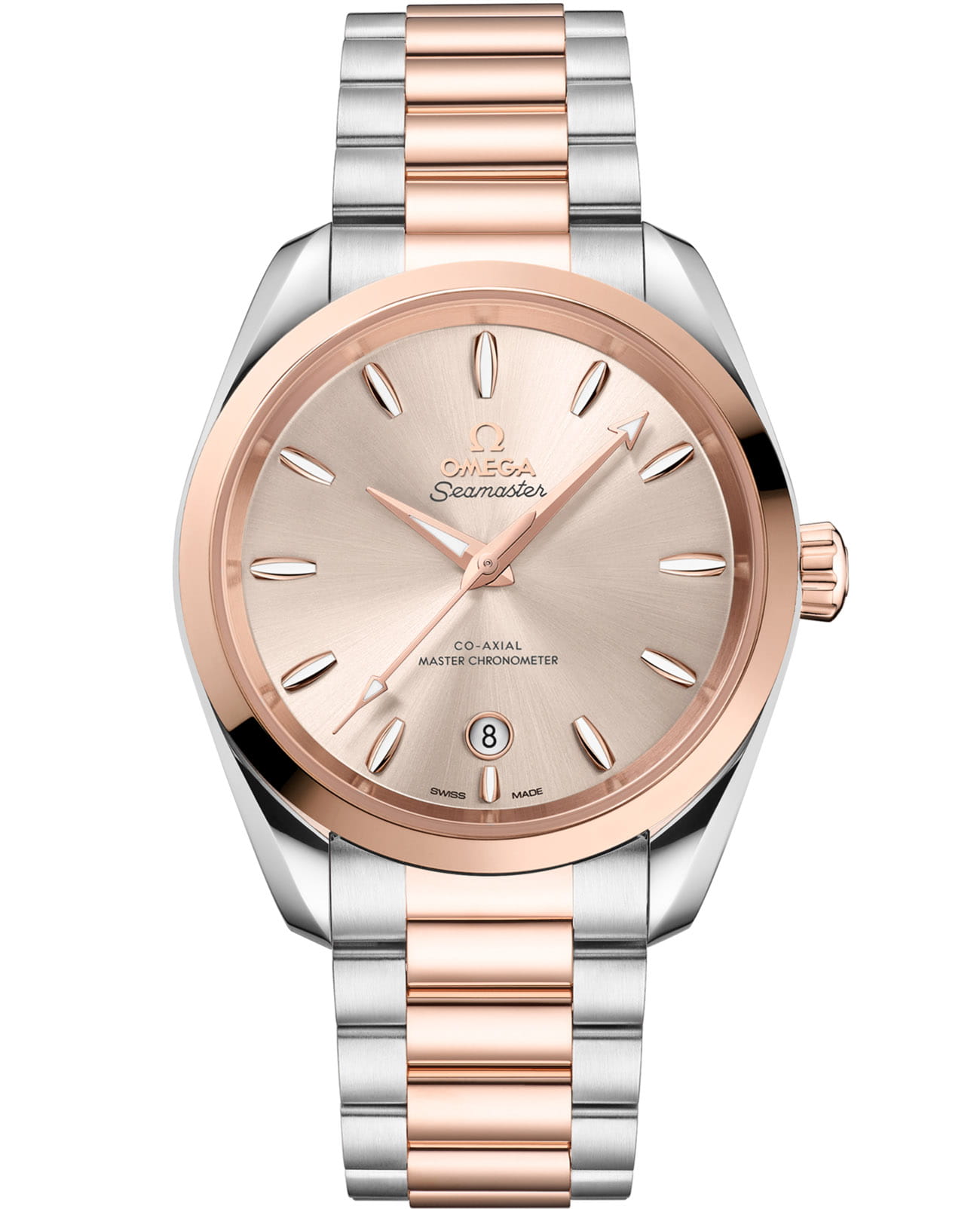 Omega Seamaster Aqua Terra выполнены в симметричном корпусе из нержавеющей стали и 18K Sedna™ золота с завинчивающейся задней крышкой, украшенной волновым узором. Циферблат дополнен окошком даты на 6 часах. Стрелки и метки оснащены люминесцентным покрытиемЛюминесцентное покрытиеПозволяет считывать показания времени в темноте. Производители наносят на стрелки, часовые индексы, безель или поверхность циферблата светонакопительный состав, дающий холодное свечение. Super-LumiNova для лучшей читаемости в темноте. Калибр Omega 8800 сертифицирован как Master Chronometer — гарантия высочайшей точности и устойчивости к магнитным полям. Запас хода составляет 55 часов. Защиту циферблата обеспечивает сапфировое стеклоСапфировое стеклоПрочный и надёжный материал из кристалла сапфира синтетического происхождения, характеризующийся особой твёрдостью и устойчивостью к царапинам и повреждениям. с антибликовым покрытиемАнтибликовое покрытиеСлой оксида металла в 0,13-0,3 микрон, благодаря которому стекло часов не бликует и не отражает свет. Антибликовое покрытие уменьшает отражение света в 10 раз, обеспечивая отличную читаемость показателей циферблата.. Водозащита позволяет использовать часы в воде без риска повреждения. Часы установлены на комбинированный браслет из 18K Sedna™ золота и нержавеющей стали с застёжка «бабочка» с кнопкамиЗастёжка "бабочка"Такой вид застёжки дополняется предохранителями, помогающими избежать случайного раскрытия браслета. Обладают изящным исполнением. . Это сочетание премиального качества, технологичности и классического дизайна.