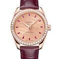 Omega Seamaster Aqua Terra выполнены в симметричном корпусе из 18K Sedna™ золота с завинчивающейся задней крышкой, украшенной волновым узором. Безель инкрустирован бриллиантами, что добавляет модели роскошный акцент. Циферблат дополнен окошком даты и оформлен уникальным волновым рисунком, созданным методом wire bonding — технологией, используемой в микроэлектронике. Циферблат имеет основу из 18K золота и покрыт PVD для стойкости цвета. Часовые метки представлены рубинами, а стрелки выполнены из 18K Sedna™ золота и оснащены люминесцентным покрытиемЛюминесцентное покрытиеПозволяет считывать показания времени в темноте. Производители наносят на стрелки, часовые индексы, безель или поверхность циферблата светонакопительный состав, дающий холодное свечение. Super-LumiNova для лучшей читаемости в темноте. Калибр Omega 8807 сертифицирован как Master Chronometer — гарантия высочайшей точности и устойчивости к магнитным полям. Запас хода составляет 55 часов. Защиту циферблата обеспечивает сапфировое стеклоСапфировое стеклоПрочный и надёжный материал из кристалла сапфира синтетического происхождения, характеризующийся особой твёрдостью и устойчивостью к царапинам и повреждениям. с антибликовым покрытиемАнтибликовое покрытиеСлой оксида металла в 0,13-0,3 микрон, благодаря которому стекло часов не бликует и не отражает свет. Антибликовое покрытие уменьшает отражение света в 10 раз, обеспечивая отличную читаемость показателей циферблата. с обеих сторон. Водозащита позволяет использовать часы в воде без риска повреждения. Часы установлены на красный кожаный ремешок. Это сочетание премиального качества, технологичности и классического дизайна.