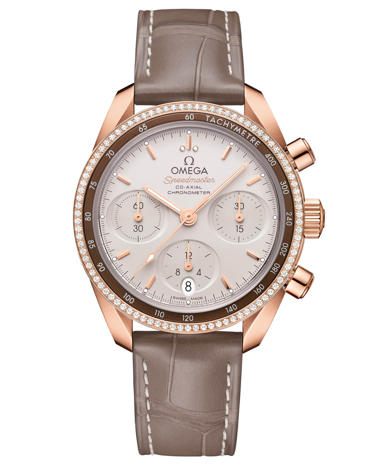 отличается уникальным двойным безлемБезельВнешний ободок, закрепляющий стекло. В спортивных часах так называется поворотное кольцо с делениями на циферблате, выполняет роль таймера – замеряет отрезки времени на шкале. Неподвижный безель – элемент декора. Однонаправленно вращающийся безель на дайверских часах позволяет фиксировать моменты погружения и выныривания на поверхность.: внутреннее кольцо из коричневого алюминия с тахиметрической шкалойТахиметрРазмеченная шкала, располагается на ободке или безеле часов. Тахиметр позволяет рассчитать скорость на определённом участке пути, расстояние измеряется в километрах или милях. эффектно контрастирует с внешним бриллиантовым паве. Циферблат цвета капучино украшают горизонтальные коричневые овальные счетчики и вертикальное окошко даты на 6 часах. Индексы и стрелки из золота Sedna™18-каратное золотоОбозначение по каратной системе пробирования, оно показывает, сколько драгоценного металла содержится в изделии. 18 карат - в составе 75% чистого золота, соответствует 750 пробе.