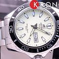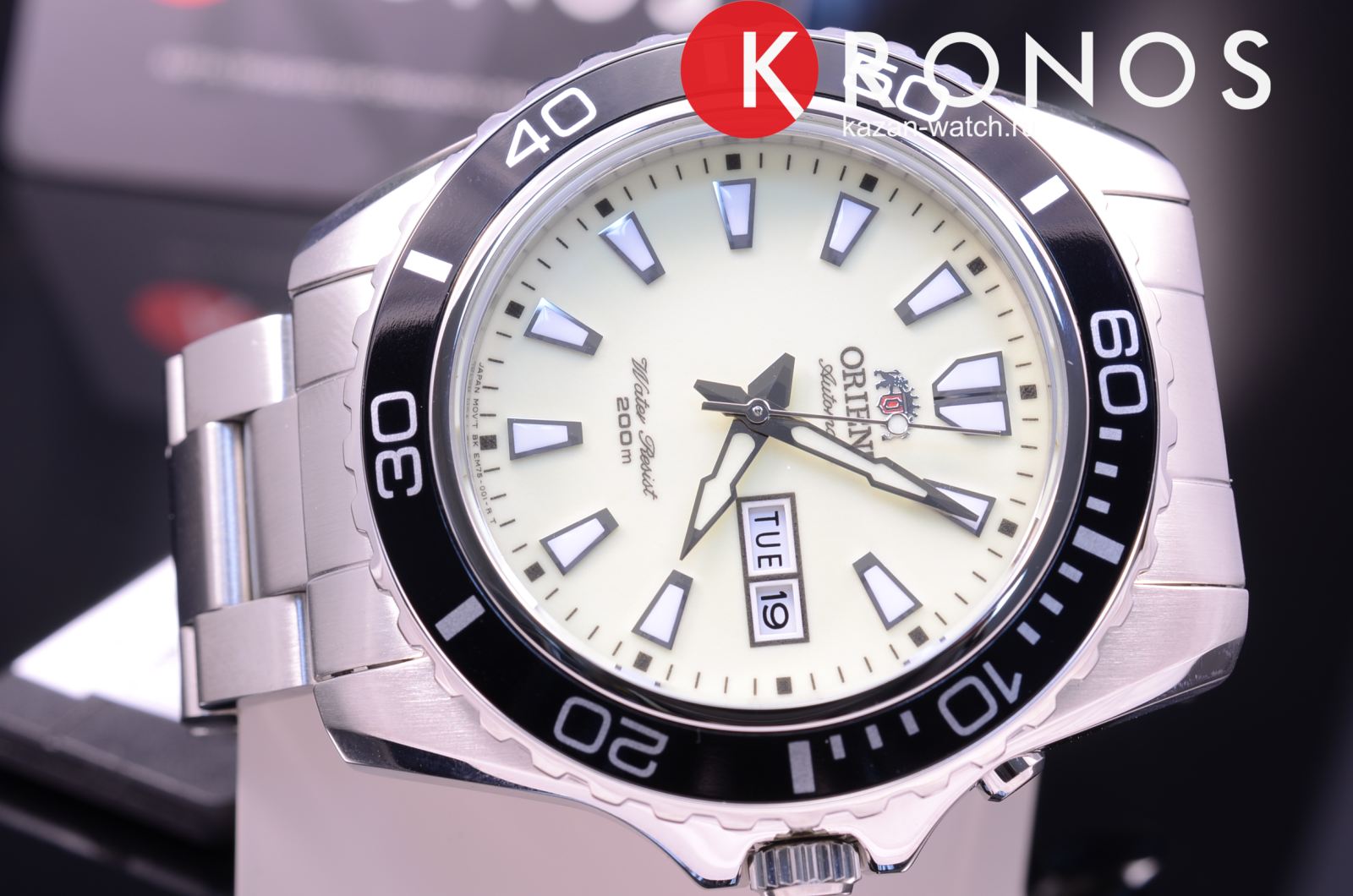 Светлый циферблат с крупной индикацией времени не имеет лишних деталей. Японский автоматический калибр Orient 46943 имеет запас хода на 40 часов. Завинчивающаяся задняя крышка и заводная головка усиливают водостойкость в 200 метров. люминесцентная подсветкаЛюминесцентное покрытиеПозволяет считывать показания времени в темноте. Производители наносят на стрелки, часовые индексы, безель или поверхность циферблата светонакопительный состав, дающий холодное свечение. позволяет просматривать время и в темноте. На позиции 3 часов – окошко даты и дня недели.