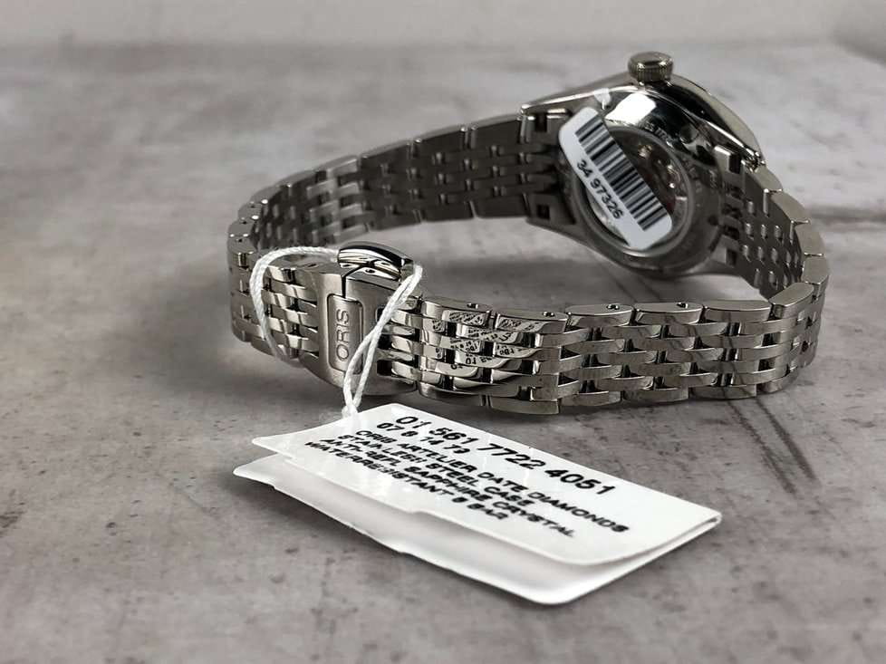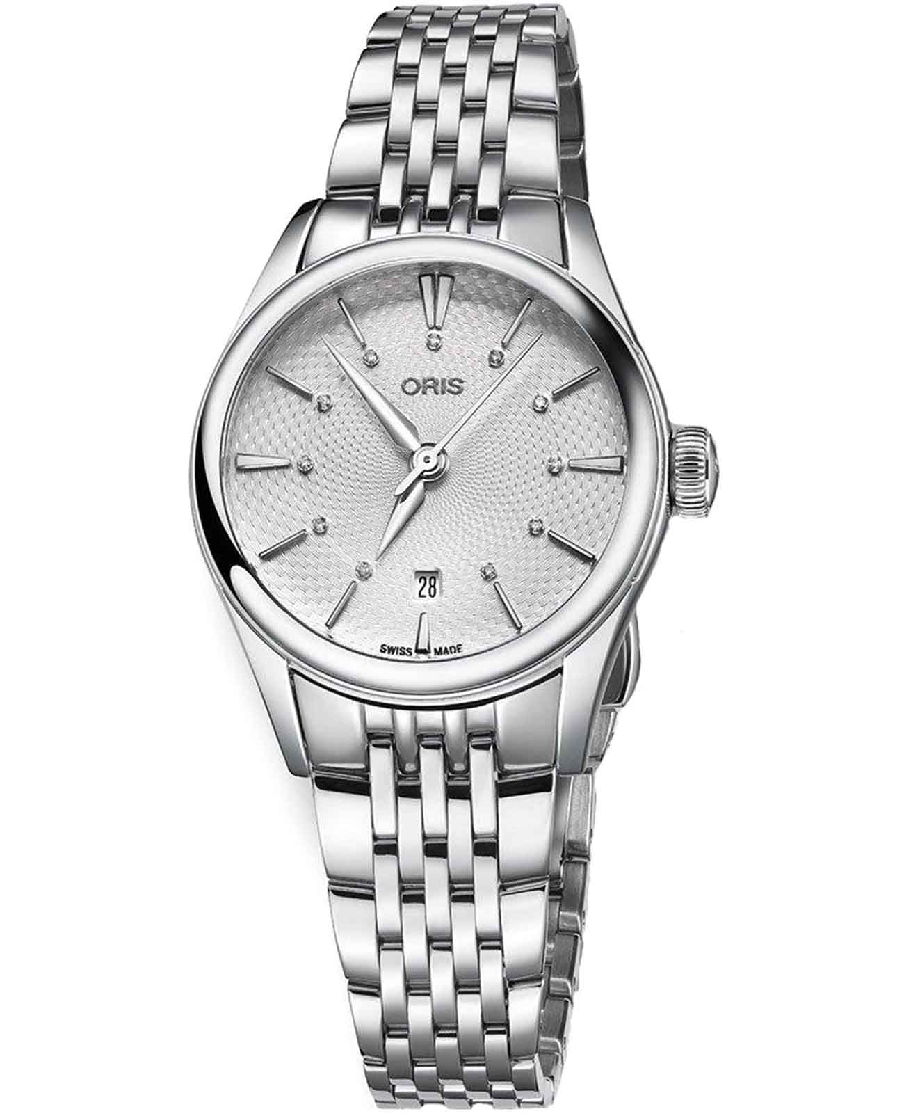 Oris 01 561 7722 4051-07 8 14 79 Artelier – это элегантные часы, сочетающие в себе классический дизайн и современную функциональность. Корпус из нержавеющей стали диаметром 28 мм идеально подходит для тех, кто ценит утонченность и стиль. Сапфировое стеклоСапфировое стеклоПрочный и надёжный материал из кристалла сапфира синтетического происхождения, характеризующийся особой твёрдостью и устойчивостью к царапинам и повреждениям. с антибликовым покрытием защищает циферблат от царапин и обеспечивает отличную читаемость при любом освещении. Стальной браслет на застёжке-бабочке с кнопкамиЗастёжка "бабочка"Такой вид застёжки дополняется предохранителями, помогающими избежать случайного раскрытия браслета. Обладают изящным исполнением. идеально дополняет дизайн часов, обеспечивая комфортное ношение. Часы оснащены центральной секундной стрелкой и окошком даты в положении «6 часов», что делает их функциональными для повседневного использования. Часы обладают водонепроницаемостью в 5 бар (50 метров). Каждая из этих функций прекрасно отображается на потрясающем циферблате, украшенном накладными индексами, гладкими стрелками из нержавеющей стали с бриллиантами 0,0152 карата, установленными в маркерах, и легендарным логотипом Oris.