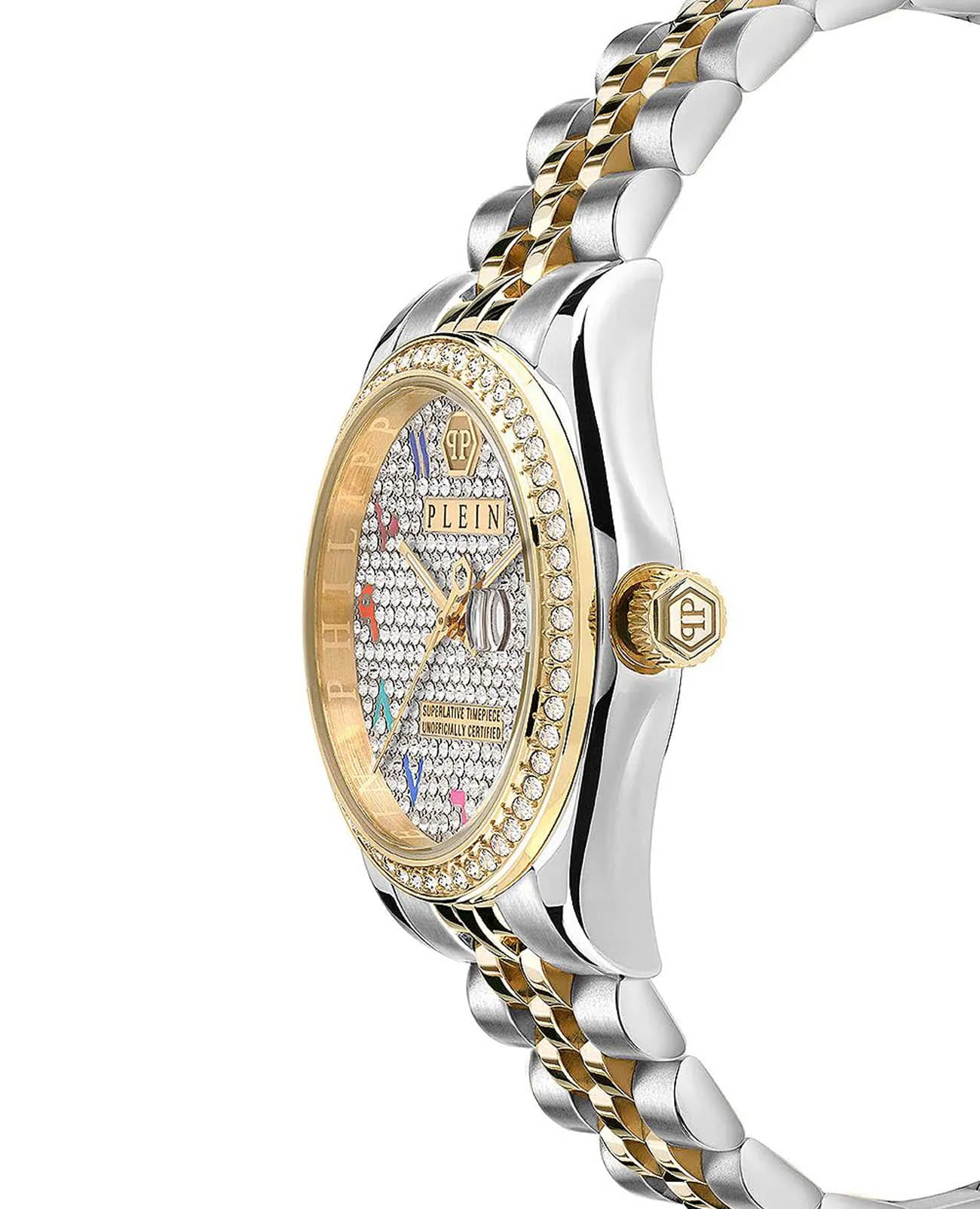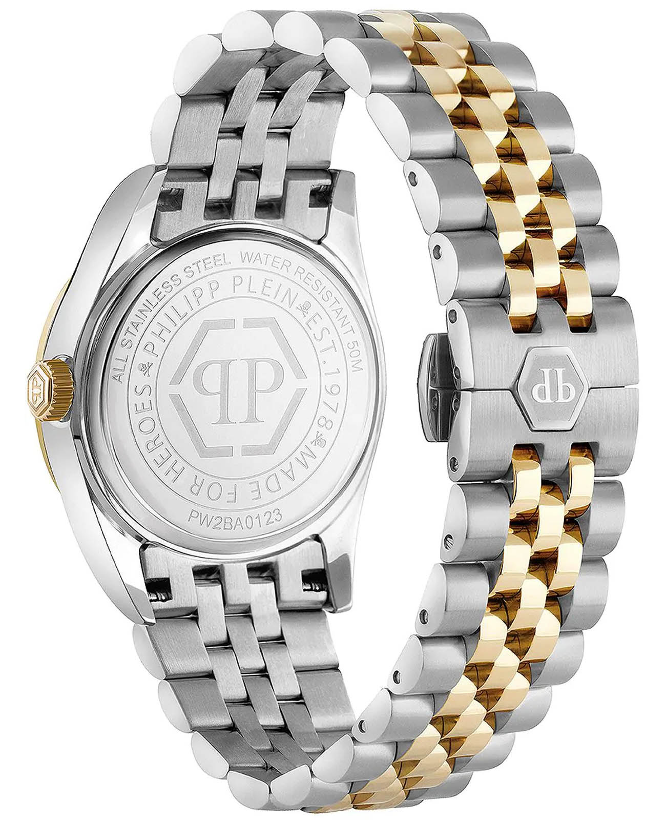 Стильные женские часы Philipp Plein Street Couture PW2BA0123 с надежным кварцевым механизмом. Корпус часов изготовлен из нержавеющей стали. Минеральное стеклоМинеральное стеклоМинеральное стекло представляет собой искусственно выращенный минерал кварца. Такое стекло отличается особой устойчивостью к повреждениям и царапинам. Уступает по некоторым качествам сапфировому стеклу. устойчивое к мелким механическим повреждениям. Влагозащита: 50 метров, позволит защитить корпус от случайных брызг или капель дождя. Стрелки с люминесцентным покрытиемЛюминесцентное покрытиеПозволяет считывать показания времени в темноте. Производители наносят на стрелки, часовые индексы, безель или поверхность циферблата светонакопительный состав, дающий холодное свечение.. Стальной браслет на застёжке-бабочке с кнопкамиЗастёжка "бабочка"Такой вид застёжки дополняется предохранителями, помогающими избежать случайного раскрытия браслета. Обладают изящным исполнением. . Циферблат и безельБезельВнешний ободок, закрепляющий стекло. В спортивных часах так называется поворотное кольцо с делениями на циферблате, выполняет роль таймера – замеряет отрезки времени на шкале. Неподвижный безель – элемент декора. Однонаправленно вращающийся безель на дайверских часах позволяет фиксировать моменты погружения и выныривания на поверхность. инкрустированы кристаллами Preciosa. Окошко даты находится в положении 3 часа.