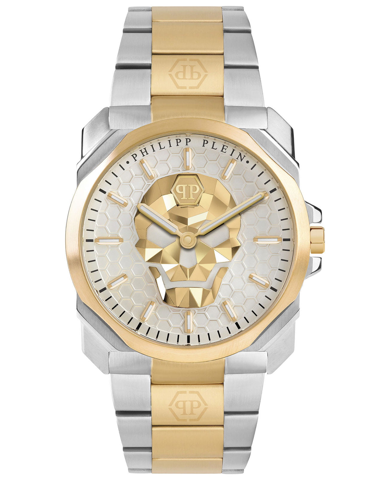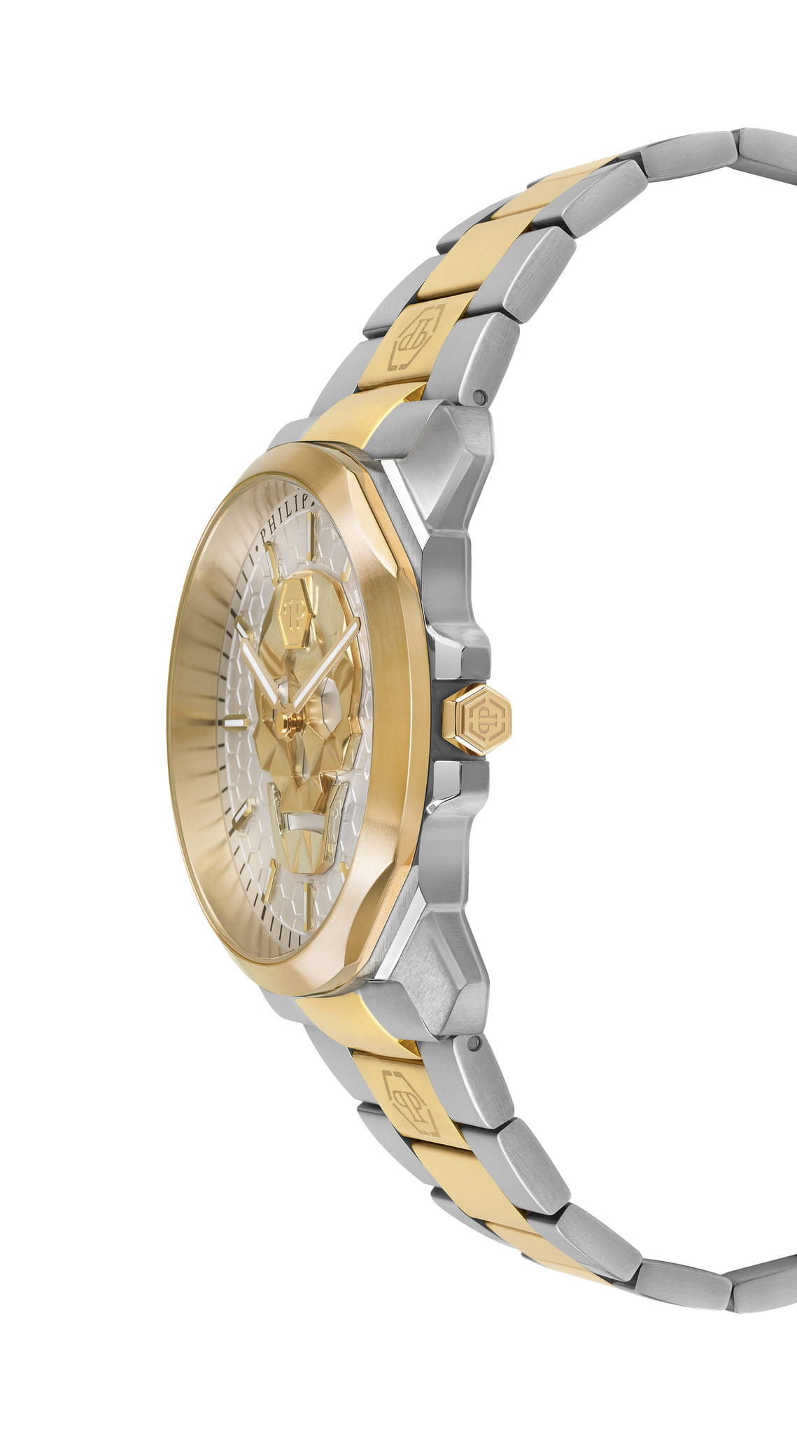 Мужские кварцевые часы с фирменным изображением черепа Philipp Plein The Skull King PWLAA0722, кварцевый механизм с высокой точностью. Класс водозащиты: 50 метров, позволит защитить корпус от случайных брызг или капель дождя. Корпус и браслет часов изготовлены из стали с частичным IP-покрытиемIP-покрытиеМетод ионного напыления. Демонстрирует повышенную устойчивость к истиранию, окислению и химическим веществам. Под воздействием высокого давления и температуры около 1500°C молекулы металла надёжно соединяются с частицами корпуса часов. цвета желтое золото. Прочное минеральное стеклоМинеральное стеклоМинеральное стекло представляет собой искусственно выращенный минерал кварца. Такое стекло отличается особой устойчивостью к повреждениям и царапинам. Уступает по некоторым качествам сапфировому стеклу. устойчивое к мелким механическим повреждениям. Браслет дополняет застёжка-бабочка с кнопкамиЗастёжка "бабочка"Такой вид застёжки дополняется предохранителями, помогающими избежать случайного раскрытия браслета. Обладают изящным исполнением. .