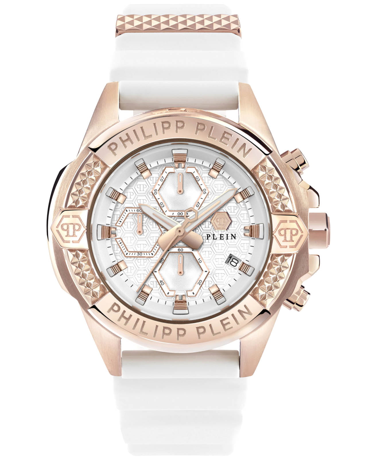 Philipp Plein The $kull Chrono PWWFA0325 - яркие часы-хронографХронографФункция позволяет измерять отрезки времени с особой точностью: часы, минуты, секунды. Верным признаком хронографа является наличие на циферблате 3 дополнительных окошек-счётчиков. в революционном дизайне несомненно добавят вам выразительности и станут главным акцентом вашего стильного образа. Мужские кварцевые часы с высокой точностью. Круглый стальной корпус с PVD-покрытиемPVDУльтратонкое покрытие наносится в технике вакуумного напыления, сочетает в себе нитрид титана особой прочности со слоем золота или оксида хрома. Несёт в себе декоративную или защитную функцию. цвета розового золота, диаметром 44 мм. Метки в виде штрихов. Минеральное стеклоМинеральное стеклоМинеральное стекло представляет собой искусственно выращенный минерал кварца. Такое стекло отличается особой устойчивостью к повреждениям и царапинам. Уступает по некоторым качествам сапфировому стеклу. защищает циферблат от царапин. Люминесцентное покрытиеЛюминесцентное покрытиеПозволяет считывать показания времени в темноте. Производители наносят на стрелки, часовые индексы, безель или поверхность циферблата светонакопительный состав, дающий холодное свечение. стрелок и меток позволит следить за временем даже в полной темноте. Окошко даты находится в положении 4 часа. Силиконовый ремешок на стандартной застёжке, обеспечивает комфортное ношение. Граненая заводная головка. Влагозащита: 50 метров, позволит защитить корпус от случайных брызг или капель дождя. Идеальный аксессуар для тех, кто ценит индивидуальность и не боится выделяться из толпы.