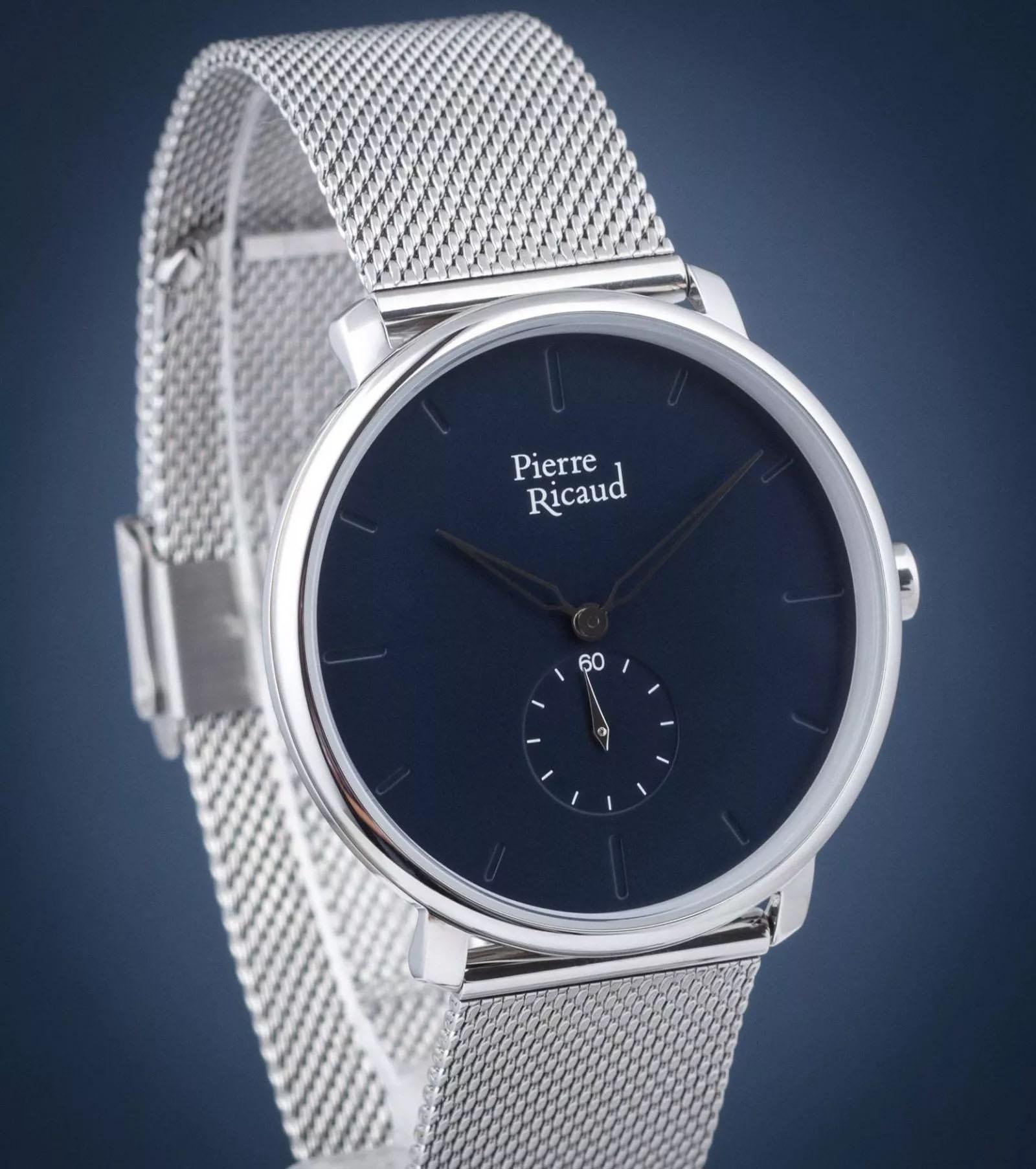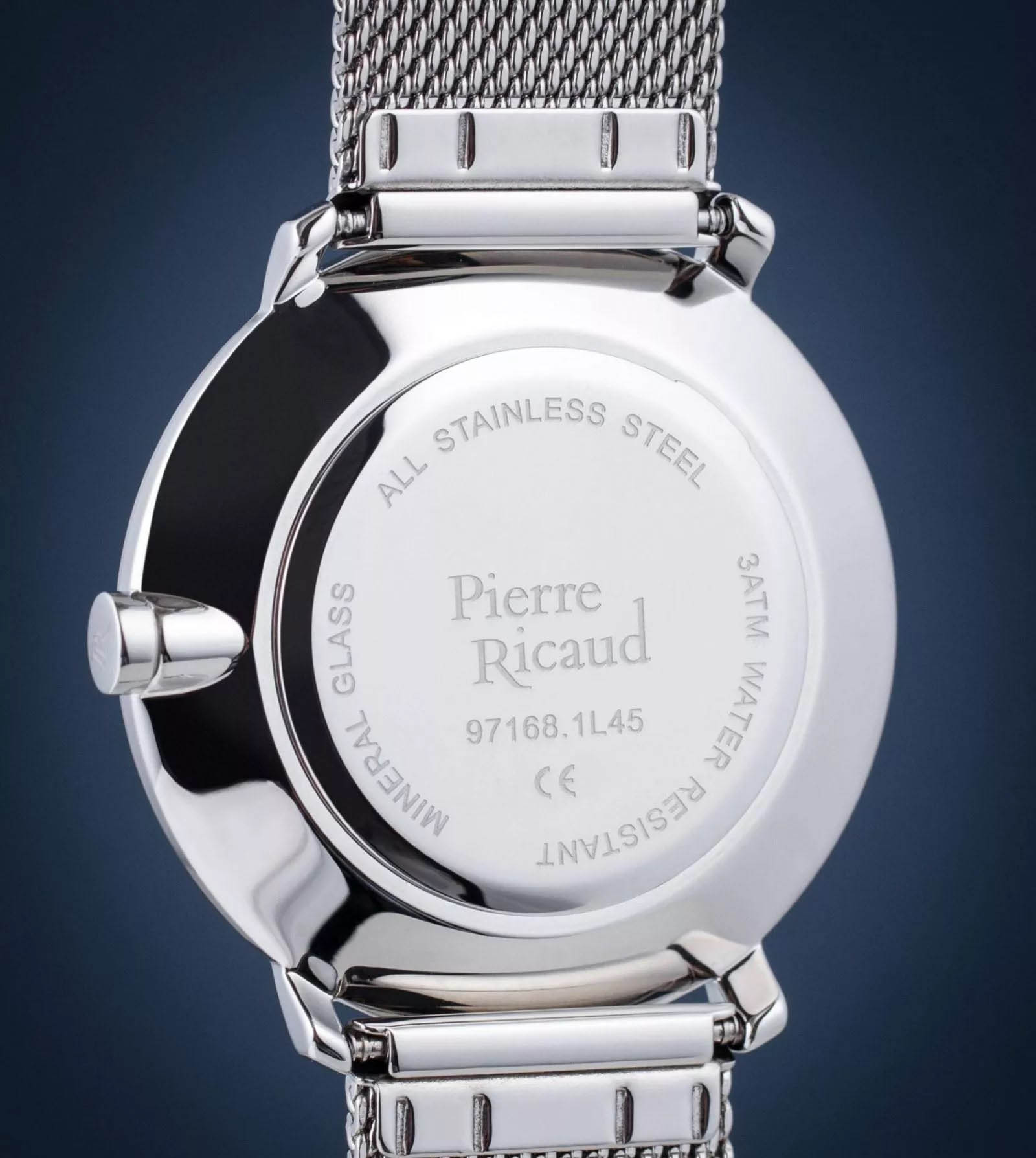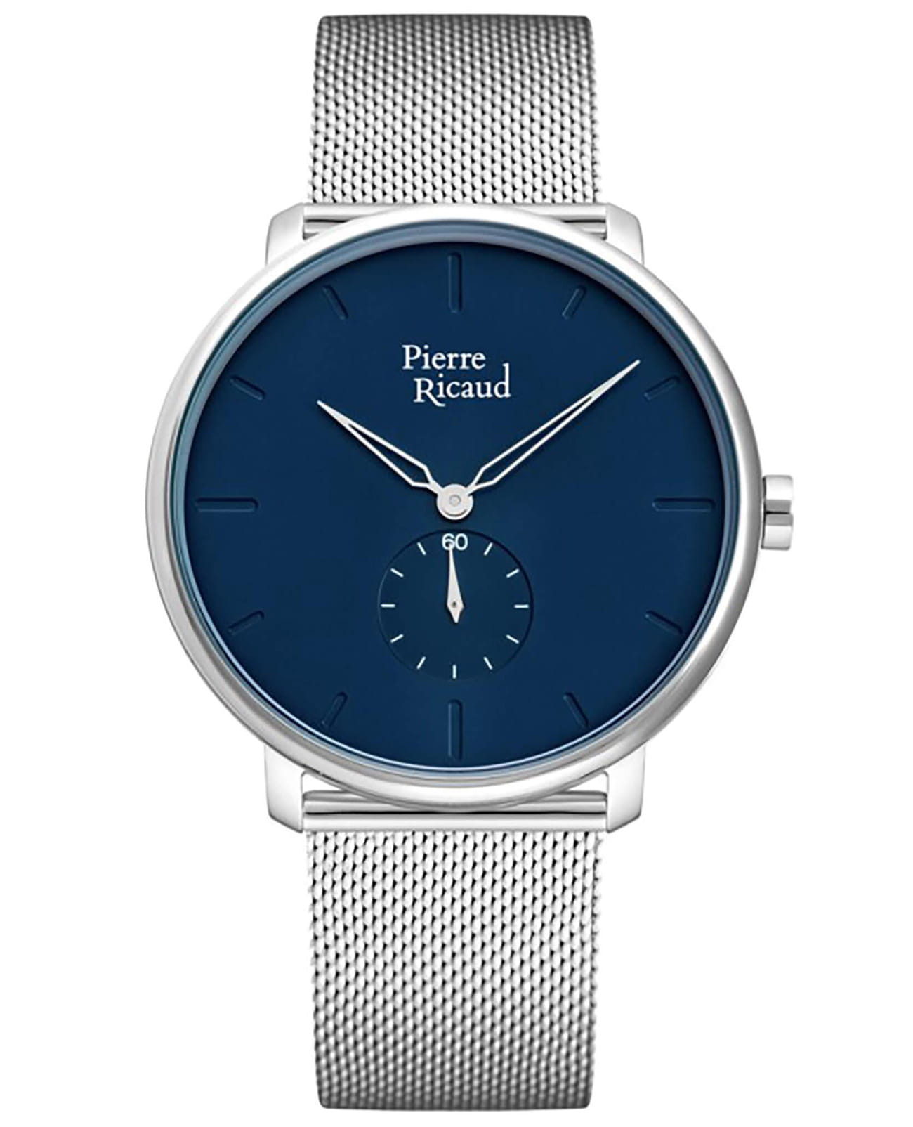 Мужские часы с минеральным стекломМинеральное стеклоМинеральное стекло представляет собой искусственно выращенный минерал кварца. Такое стекло отличается особой устойчивостью к повреждениям и царапинам. Уступает по некоторым качествам сапфировому стеклу. Pierre Ricaud P97168.5115Q, кварцевый механизм с высокой точностью. Класс водозащиты: 30 метров, позволит защитить корпус от случайных брызг или капель дождя. Корпус часов изготовлен из стали. Стальной браслет на раскладной застёжкеРаскладная застёжкаТакой тип застёжки используется только на браслетах из металла. Она никогда не раскрывается полностью, происходит разделение на 2 и более частей. Раскладывающая застёжка снизит вероятность потери часов к минимуму.. Вынесенная секундная стрелка.