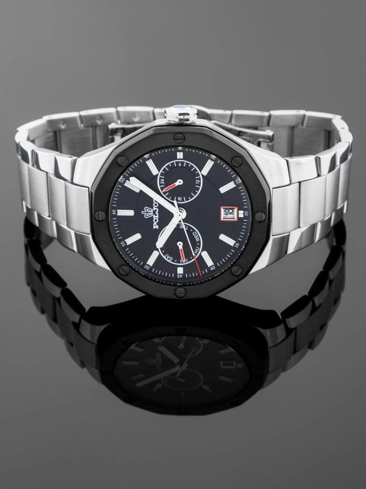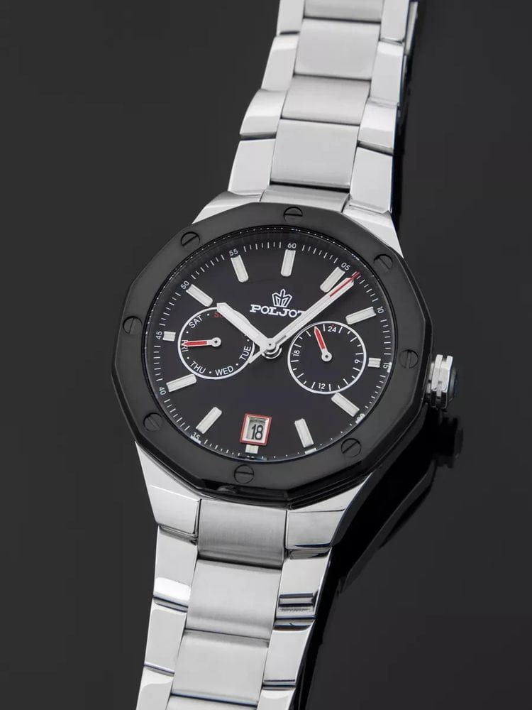 Poljot Ural JP21.363267Б — стильные кварцевые часы, сочетающие брутальный характер и современную элегантность. Корпус выполнен из нержавеющей стали, что придаёт модели монолитность и прочность, а глубокий циферблат подчеркивает премиальный облик. БезельБезельВнешний ободок, закрепляющий стекло. В спортивных часах так называется поворотное кольцо с делениями на циферблате, выполняет роль таймера – замеряет отрезки времени на шкале. Неподвижный безель – элемент декора. Однонаправленно вращающийся безель на дайверских часах позволяет фиксировать моменты погружения и выныривания на поверхность. с PVD-покрытиемPVDУльтратонкое покрытие наносится в технике вакуумного напыления, сочетает в себе нитрид титана особой прочности со слоем золота или оксида хрома. Несёт в себе декоративную или защитную функцию.. Стальной браслет на застёжке-бабочке с кнопкамиЗастёжка "бабочка"Такой вид застёжки дополняется предохранителями, помогающими избежать случайного раскрытия браслета. Обладают изящным исполнением. . Внутри установлен надёжный кварцевый механизм, обеспечивающий точный ход и плавную работу стрелок. Широкие метки и стрелки с люминесцентным покрытиемЛюминесцентное покрытиеПозволяет считывать показания времени в темноте. Производители наносят на стрелки, часовые индексы, безель или поверхность циферблата светонакопительный состав, дающий холодное свечение. гарантируют превосходную читаемость в любое время суток, а окно даты добавляет удобства. Прочное минеральное стеклоМинеральное стеклоМинеральное стекло представляет собой искусственно выращенный минерал кварца. Такое стекло отличается особой устойчивостью к повреждениям и царапинам. Уступает по некоторым качествам сапфировому стеклу. защищает циферблат от повреждений, а водонепроницаемость до 10 бар делает часы надёжным спутником как в деловом, так и активном образе жизни. Poljot Ural — воплощение силы, точности и мужского стиля, созданное для тех, кто ценит механику и уверенность в каждой детали.