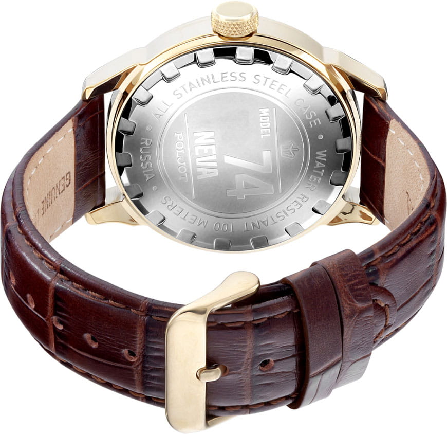 Poljot 8215.746036 — элегантные механические мужские часы с автоподзаводом, сочетающие традиции отечественного часового производства и классический дизайн. Корпус из нержавеющей стали с тёплым золотистым с PVD-покрытиемPVDУльтратонкое покрытие наносится в технике вакуумного напыления, сочетает в себе нитрид титана особой прочности со слоем золота или оксида хрома. Несёт в себе декоративную или защитную функцию. придаёт модели благородный характер, а белый циферблат с чёткой разметкой и аккуратным окном даты на позиции «3 часа» подчёркивает функциональную строгость стиля. Надёжный механизм с автоподзаводом обеспечивает плавный ход стрелок и стабильную работу. Прочное минеральное стеклоМинеральное стеклоМинеральное стекло представляет собой искусственно выращенный минерал кварца. Такое стекло отличается особой устойчивостью к повреждениям и царапинам. Уступает по некоторым качествам сапфировому стеклу. защищает циферблат от повреждений, а ремешок из натуральной кожи с классической пряжкой добавляет образу утончённости и комфорта. Poljot — это воплощение надёжности, традиции и сдержанной элегантности, идеально подходящее для повседневного делового стиля.