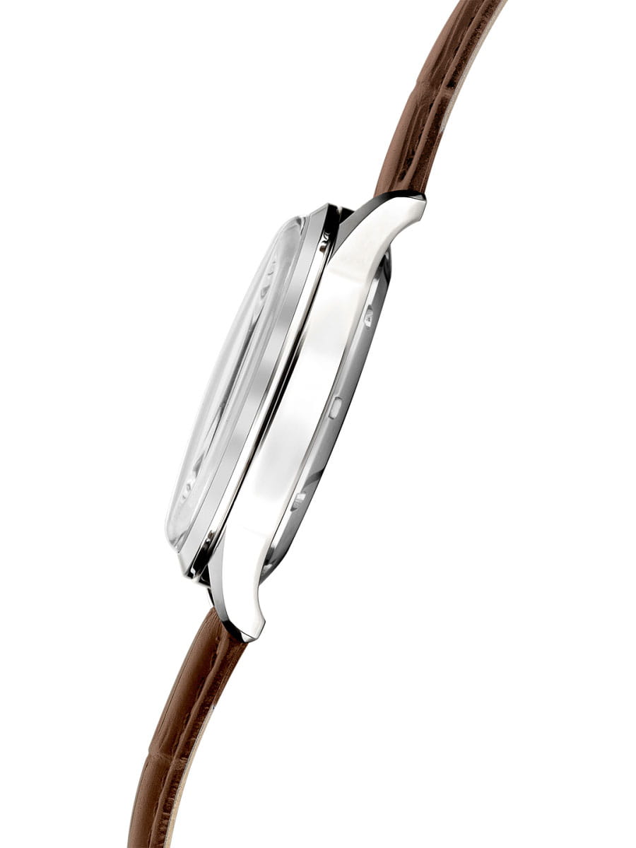 Poljot 82S0.581023 — изысканные механические мужские часы с автоподзаводом, в которых классика сочетается с технической эстетикой. Корпус из нержавеющей стали подчёркивает надёжность и строгость формы, а глубокий циферблат с изящным окном «open heart» демонстрирует работу механизма, придавая модели характер инженерной утончённости. Стрелки и метки с люминесцентным покрытиемЛюминесцентное покрытиеПозволяет считывать показания времени в темноте. Производители наносят на стрелки, часовые индексы, безель или поверхность циферблата светонакопительный состав, дающий холодное свечение.. Металлизированные стрелки и метки создают аккуратный контраст и обеспечивают превосходную читаемость, а прочное минеральное стеклоМинеральное стеклоМинеральное стекло представляет собой искусственно выращенный минерал кварца. Такое стекло отличается особой устойчивостью к повреждениям и царапинам. Уступает по некоторым качествам сапфировому стеклу. надёжно защищает циферблат от повреждений. Ремешок из натуральной кожи тёплого коричневого оттенка добавляет образу благородства и комфорта. Poljot — это часы для мужчин, ценящих механику, традиции и спокойную уверенность в каждой детали.