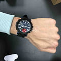 , секундомер. Японский кварцевый механизм получает питание от солнечной батареи . Режим сохранения энергии. Надёжный полимерный корпус. Стальной безельБезельВнешний ободок, закрепляющий стекло. В спортивных часах так называется поворотное кольцо с делениями на циферблате, выполняет роль таймера – замеряет отрезки времени на шкале. Неподвижный безель – элемент декора. Однонаправленно вращающийся безель на дайверских часах позволяет фиксировать моменты погружения и выныривания на поверхность. с цветным IP-покрытиемIP-покрытиеМетод ионного напыления. Демонстрирует повышенную устойчивость к истиранию, окислению и химическим веществам. Под воздействием высокого давления и температуры около 1500°C молекулы металла надёжно соединяются с частицами корпуса часов.. Чёрный ремешок из кожзаменителя. Водостойкость 10 бар. Устойчивость к температурам ниже -10 °C. Светодиодная подсветкаСветодиодная подсветкаСветодиодная или LED-подсветка обеспечивает появление яркого холодного свечения за счёт LED-элементов - маленьких лампочек. Они потребляют минимальное количество энергии, чаще всего можно встретить 1 светодиод, в нижней части циферблата. дисплея и циферблата. Перемещение стрелок для удобной читаемости показателей с отдельных счётчиков. Габариты: 52 x 51,1 x 13 мм.