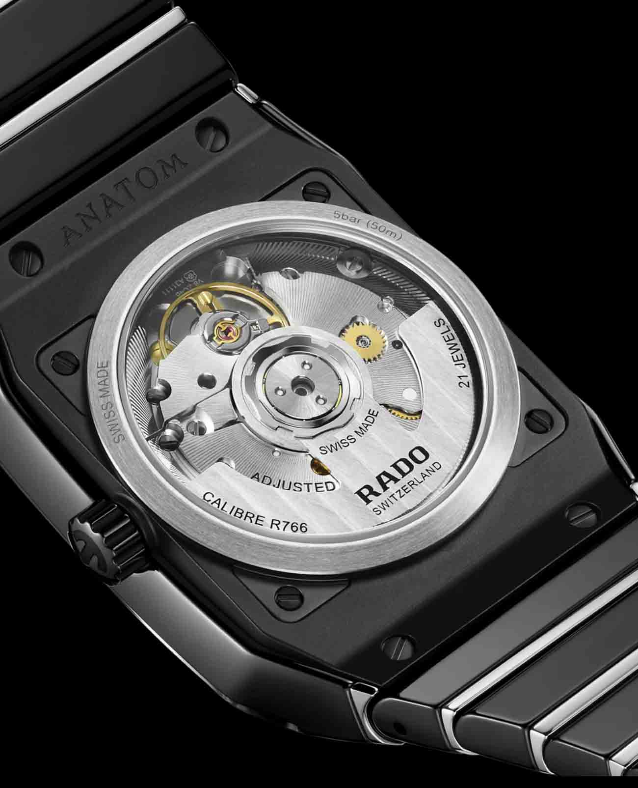 Мужские швейцарские механические часы Rado Anatom Automatic R10204712. Сапфировое стеклоСапфировое стеклоПрочный и надёжный материал из кристалла сапфира синтетического происхождения, характеризующийся особой твёрдостью и устойчивостью к царапинам и повреждениям. устойчивое к мелким механическим повреждениям. Корпус часов изготовлен из нержавеющей стали и керамики. Стрелки с люминесцентным покрытиемЛюминесцентное покрытиеПозволяет считывать показания времени в темноте. Производители наносят на стрелки, часовые индексы, безель или поверхность циферблата светонакопительный состав, дающий холодное свечение.. Венчает циферблат на отметке 12 часов культовый подвижный якорь, дополненный сдержанным окошком даты, расположенным на отметке 6 часов. Класс водозащиты: 50 метров, позволит защитить корпус от случайных брызг или капель дождя. Браслет из полированных черных высокотехнологичных керамических звеньев и полированных средних звеньев из нержавеющей стали, инкрустированных 162 бриллиантами Top Wesselton полной огранки, браслет тщательно закреплен на застёжке-бабочке с кнопкамиЗастёжка "бабочка"Такой вид застёжки дополняется предохранителями, помогающими избежать случайного раскрытия браслета. Обладают изящным исполнением. . 3 бриллианта Top Wesselton полной огранки и стрелки цвета родия с белым покрытием Super-LumiNova® создают сияющий контраст на фоне глубины циферблата.