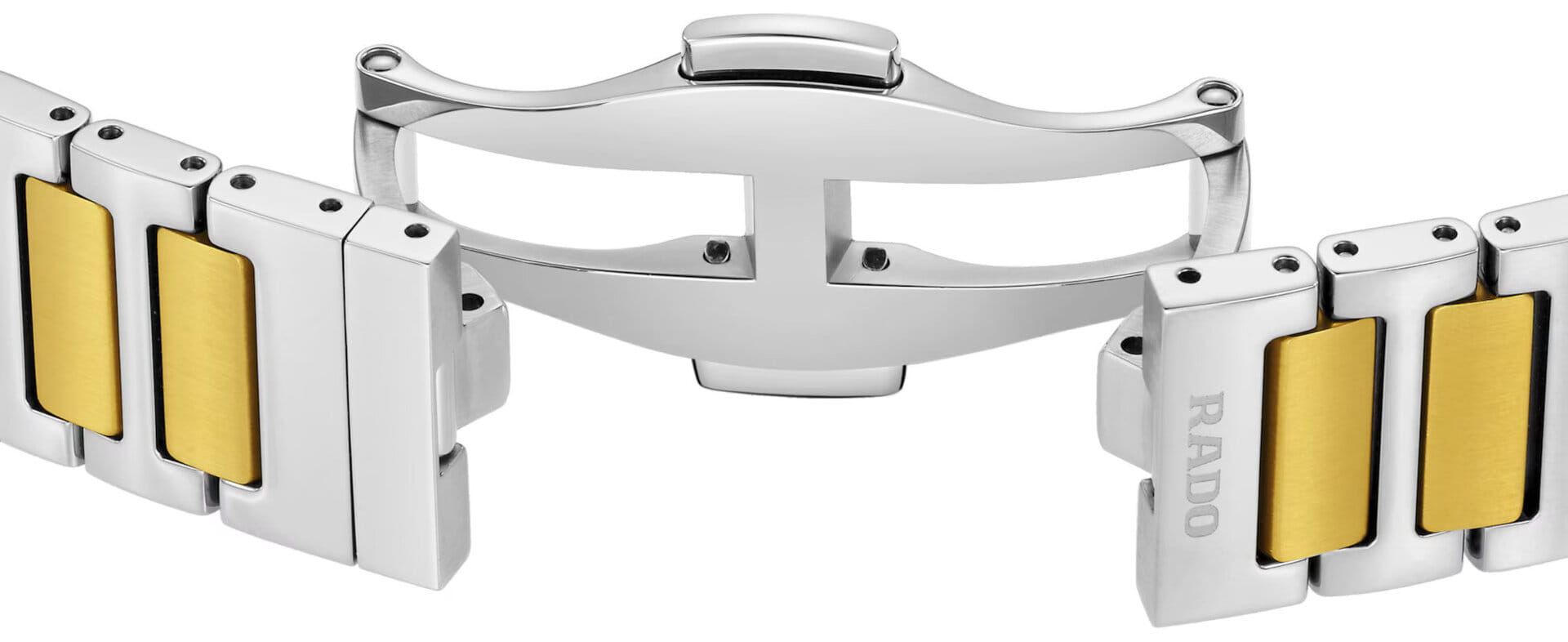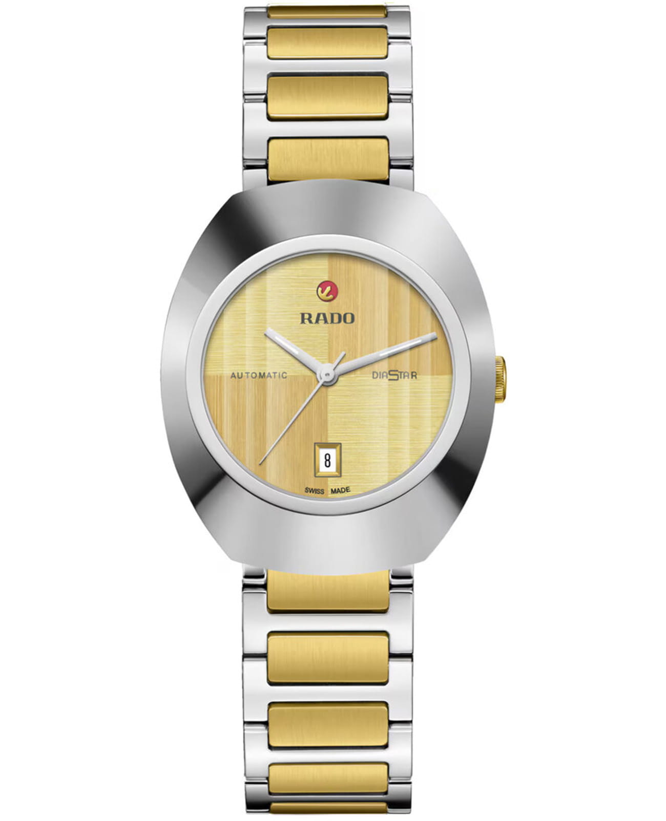 Женские механические часы с автоподзаводом Rado из коллекции Diastar Original — это элегантный аксессуар с классическим дизайном. Корпус овальной формы, диаметром 30 мм и толщиной 11 мм, выполнен из CeramosCeramosМатериал являет собой инновационное сочетание высокотехнологичной керамики и сплава металла. Он объединяет керамическую устойчивость к царапинам и металлический роскошный блеск. с PVD-покрытиемPVDУльтратонкое покрытие наносится в технике вакуумного напыления, сочетает в себе нитрид титана особой прочности со слоем золота или оксида хрома. Несёт в себе декоративную или защитную функцию. серебряного цвета. Неподвижный безельБезельВнешний ободок, закрепляющий стекло. В спортивных часах так называется поворотное кольцо с делениями на циферблате, выполняет роль таймера – замеряет отрезки времени на шкале. Неподвижный безель – элемент декора. Однонаправленно вращающийся безель на дайверских часах позволяет фиксировать моменты погружения и выныривания на поверхность. также изготовлен из Ceramos. Циферблат жёлтого цвета оформлен без индексов, с серебристыми стрелками. Циферблат защищён сапфировым стекломСапфировое стеклоПрочный и надёжный материал из кристалла сапфира синтетического происхождения, характеризующийся особой твёрдостью и устойчивостью к царапинам и повреждениям. с антибликовым покрытиемАнтибликовое покрытиеСлой оксида металла в 0,13-0,3 микрон, благодаря которому стекло часов не бликует и не отражает свет. Антибликовое покрытие уменьшает отражение света в 10 раз, обеспечивая отличную читаемость показателей циферблата. на внутренней стороне. Стрелки с люминесцентным покрытиемЛюминесцентное покрытиеПозволяет считывать показания времени в темноте. Производители наносят на стрелки, часовые индексы, безель или поверхность циферблата светонакопительный состав, дающий холодное свечение. Super-Luminova®, обеспечивающим хорошую читаемость в темноте. Механизм — автоматический калибр R586 с запасом хода 48 часов, частотой 28 800 полуколебаний в час и 25 камнями. Окошко даты расположено в положении 6 часов. Часы оснащены двухцветным стальным браслетом с застёжкой «бабочка» с кнопкамиЗастёжка "бабочка"Такой вид застёжки дополняется предохранителями, помогающими избежать случайного раскрытия браслета. Обладают изящным исполнением. . Водонепроницаемость 100 м позволяет использовать часы для плавания. Гарантия — 5 лет на механизм, 2 года на изделие. Идеальный выбор для тех, кто ценит стиль, точность и швейцарское качество.
