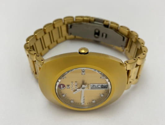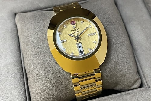 Мужские часы Rado The Original Automatic R12413703 с надёжным автоматическим механизмом. Корпус и браслет часов выполнены из нержавеющей стали c PVD-покрытиемPVDУльтратонкое покрытие наносится в технике вакуумного напыления, сочетает в себе нитрид титана особой прочности со слоем золота или оксида хрома. Несёт в себе декоративную или защитную функцию.. Браслет на раскладной застёжкеРаскладная застёжкаТакой тип застёжки используется только на браслетах из металла. Она никогда не раскрывается полностью, происходит разделение на 2 и более частей. Раскладывающая застёжка снизит вероятность потери часов к минимуму.. Класс водозащиты: 30 метров, позволит защитить корпус от случайных брызг или капель дождя. Циферблат инкрустирован бриллиантами. Окошко даты и дня недели находится в положении 6 часов. Стрелки и метки с люминесцентным покрытиемЛюминесцентное покрытиеПозволяет считывать показания времени в темноте. Производители наносят на стрелки, часовые индексы, безель или поверхность циферблата светонакопительный состав, дающий холодное свечение..