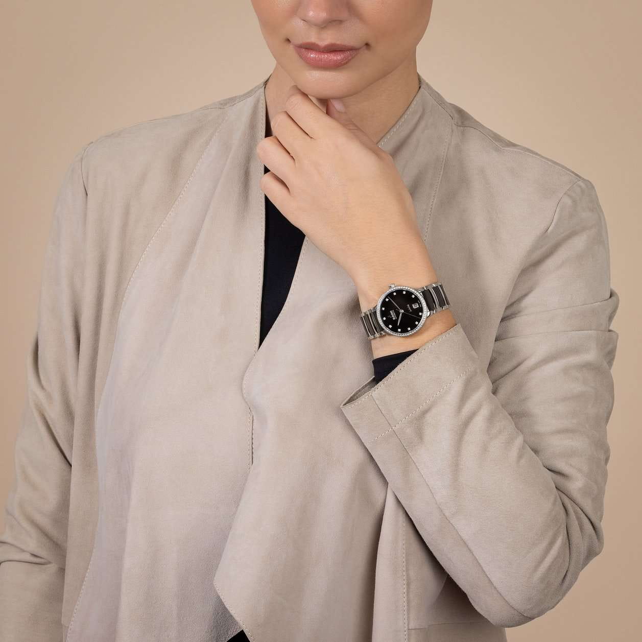Женские механические часы с автоподзаводом Rado из коллекции Centrix — это гармоничное сочетание искусства, дизайна и швейцарского мастерства. Корпус диаметром 35 мм и толщиной 11,1 мм выполнен из нержавеющей стали 316L. БезельБезельВнешний ободок, закрепляющий стекло. В спортивных часах так называется поворотное кольцо с делениями на циферблате, выполняет роль таймера – замеряет отрезки времени на шкале. Неподвижный безель – элемент декора. Однонаправленно вращающийся безель на дайверских часах позволяет фиксировать моменты погружения и выныривания на поверхность. из нержавеющей стали инкрустирован 60 бриллиантами полной огранки Top Wesselton VS-SI. Циферблат чёрного цвета с лакированным покрытием украшен 11 бриллиантами и дополнен окошком даты в положении 6 часов. Циферблат защищён выпуклым сапфировым стекломСапфировое стеклоПрочный и надёжный материал из кристалла сапфира синтетического происхождения, характеризующийся особой твёрдостью и устойчивостью к царапинам и повреждениям. с антибликовым покрытиемАнтибликовое покрытиеСлой оксида металла в 0,13-0,3 микрон, благодаря которому стекло часов не бликует и не отражает свет. Антибликовое покрытие уменьшает отражение света в 10 раз, обеспечивая отличную читаемость показателей циферблата. с обеих сторон. Механизм — автоматический калибр R763 с антимагнитной пружиной Nivachron™Nivachron™Специально разработанный инновационный сплав Nivachron™ повышает устойчивость часов к воздействию магнитных полей., отрегулированный в пяти положениях, с запасом хода 80 часов. Прозрачная задняя крышка с сапфировым стеклом позволяет наблюдать за работой механизма. Часы оснащены браслетом из полированной нержавеющей стали и вставками из высокотехнологичной керамикиВысокотехнологичная керамикаИнновационный запатентованный Rado материал с гладкой или матовой поверхностью. Керамика за счёт кристаллической структуры обладает повышенной устойчивостью от возникновения царапин. Материал способен принимать температуру тела человека, обеспечивая невероятный комфорт при ношении. чёрного цвета, а также трёхсекционной застёжкой из нержавеющей стали. Водонепроницаемость 50 м позволяет использовать часы в повседневных условиях. Гарантия — 5 лет. Идеальный выбор для тех, кто ценит роскошь, точность и элегантность.