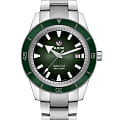 Премиальная модель обладает винтажным характером, зелёный циферблат обращает наше внимание на оригинальные стрелки в виде меча и стрелы. Часы обладают высокими показателями водонепроницаемости - сохранение герметичности до 30 бар, что стало возможным благодаря задней крышке и заводной головке с винтовыми фиксаторами. Автоподзавод. Швейцарский калибр ETA C07.611 с 80-часовым резервом хода. Антибликовая обработка сапфирового стекла. Корпус из хирургической стали 316L, безельБезельВнешний ободок, закрепляющий стекло. В спортивных часах так называется поворотное кольцо с делениями на циферблате, выполняет роль таймера – замеряет отрезки времени на шкале. Неподвижный безель – элемент декора. Однонаправленно вращающийся безель на дайверских часах позволяет фиксировать моменты погружения и выныривания на поверхность. из высокотехнологичной керамикиВысокотехнологичная керамикаИнновационный запатентованный Rado материал с гладкой или матовой поверхностью. Керамика за счёт кристаллической структуры обладает повышенной устойчивостью от возникновения царапин. Материал способен принимать температуру тела человека, обеспечивая невероятный комфорт при ношении.. Прочный стальной браслет. Отображение числа. Диаметр корпуса: 42 мм.