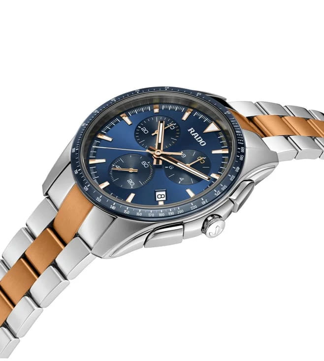 Мужские наручные часы-хронографХронографФункция позволяет измерять отрезки времени с особой точностью: часы, минуты, секунды. Верным признаком хронографа является наличие на циферблате 3 дополнительных окошек-счётчиков. Rado Hyperchrome Chronograph. Корпус часов изготовлен из нержавеющей стали. Стальной браслет с частичным PVD-покрытиемPVDУльтратонкое покрытие наносится в технике вакуумного напыления, сочетает в себе нитрид титана особой прочности со слоем золота или оксида хрома. Несёт в себе декоративную или защитную функцию. на застёжкой «бабочка» с кнопкамиЗастёжка "бабочка"Такой вид застёжки дополняется предохранителями, помогающими избежать случайного раскрытия браслета. Обладают изящным исполнением. . БезельБезельВнешний ободок, закрепляющий стекло. В спортивных часах так называется поворотное кольцо с делениями на циферблате, выполняет роль таймера – замеряет отрезки времени на шкале. Неподвижный безель – элемент декора. Однонаправленно вращающийся безель на дайверских часах позволяет фиксировать моменты погружения и выныривания на поверхность. со шкалой тахиметраТахиметрРазмеченная шкала, располагается на ободке или безеле часов. Тахиметр позволяет рассчитать скорость на определённом участке пути, расстояние измеряется в километрах или милях.. Окошко даты находится в положении 4 часа. Стрелки и метки с люминесцентным покрытиемЛюминесцентное покрытиеПозволяет считывать показания времени в темноте. Производители наносят на стрелки, часовые индексы, безель или поверхность циферблата светонакопительный состав, дающий холодное свечение.. Сапфировое стеклоСапфировое стеклоПрочный и надёжный материал из кристалла сапфира синтетического происхождения, характеризующийся особой твёрдостью и устойчивостью к царапинам и повреждениям. с антибликовым покрытиемАнтибликовое покрытиеСлой оксида металла в 0,13-0,3 микрон, благодаря которому стекло часов не бликует и не отражает свет. Антибликовое покрытие уменьшает отражение света в 10 раз, обеспечивая отличную читаемость показателей циферблата. устойчивое к мелким механическим повреждениям. Класс водозащиты: 100 метров, позволит плавать, нырять и заниматься другими водными видами спорта.