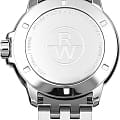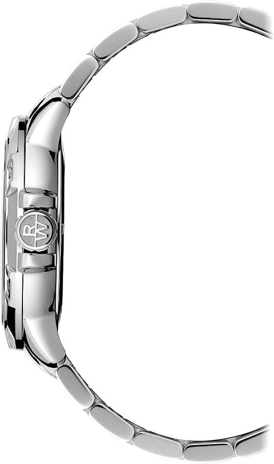 Модель оснащена фирменным безелемБезельВнешний ободок, закрепляющий стекло. В спортивных часах так называется поворотное кольцо с делениями на циферблате, выполняет роль таймера – замеряет отрезки времени на шкале. Неподвижный безель – элемент декора. Однонаправленно вращающийся безель на дайверских часах позволяет фиксировать моменты погружения и выныривания на поверхность. с шестью декоративными винтами и завинчивающейся заводной головкой с защитой и логотипом RW. Завинчивающаяся задняя крышка и стальной браслет на раскладной застёжкеРаскладная застёжкаТакой тип застёжки используется только на браслетах из металла. Она никогда не раскрывается полностью, происходит разделение на 2 и более частей. Раскладывающая застёжка снизит вероятность потери часов к минимуму. с двойной системой защиты добавляет уверенности в использовании.