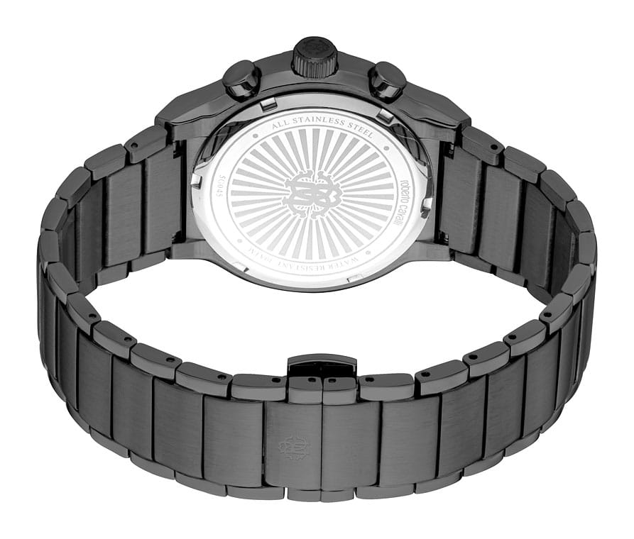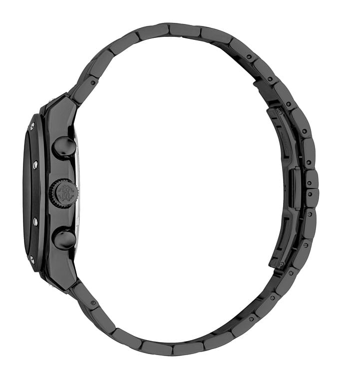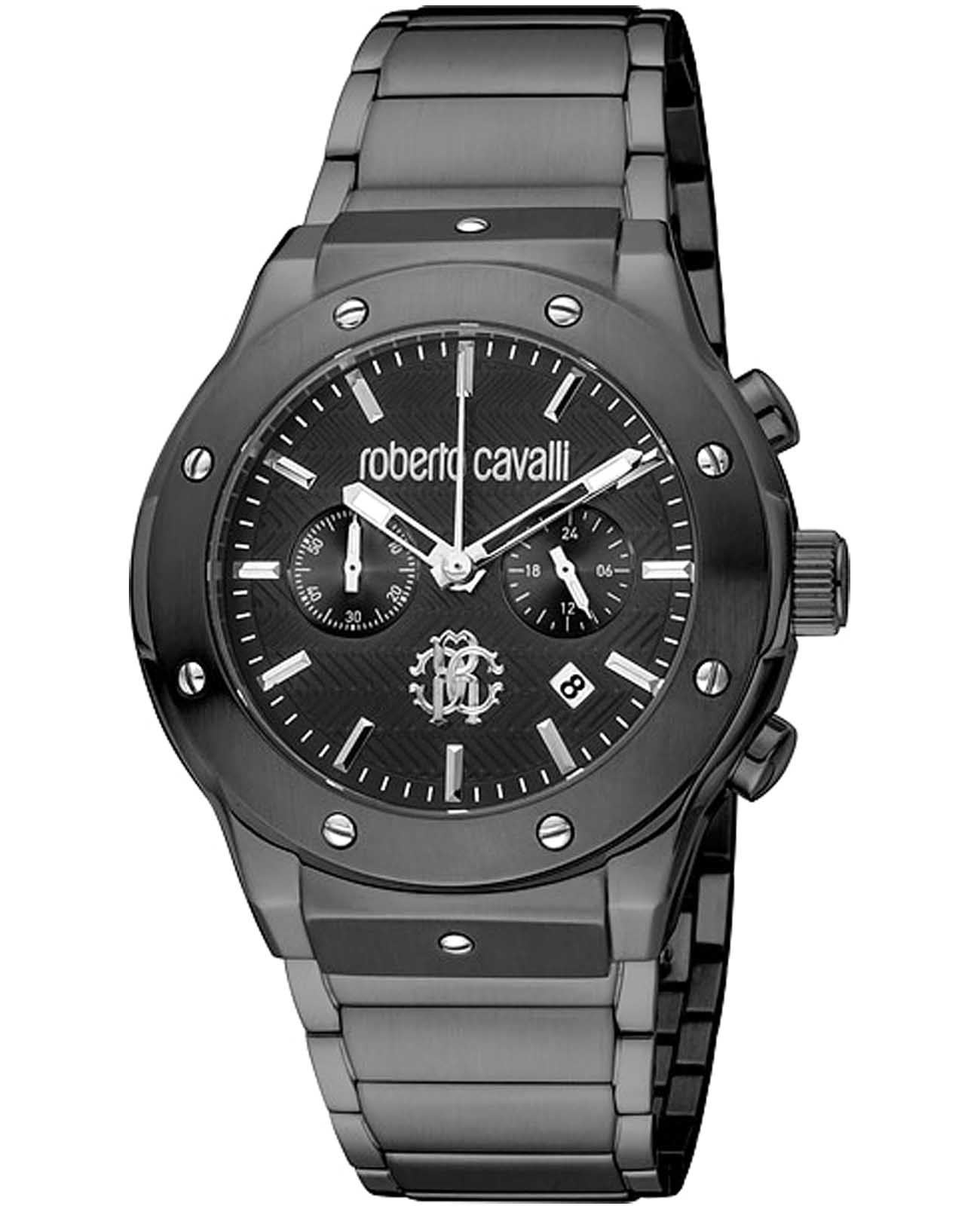 ROBERTO CAVALLI Ottimale RC5G045M0065 — стильные итальянские часы с функцией хронографаХронографФункция позволяет измерять отрезки времени с особой точностью: часы, минуты, секунды. Верным признаком хронографа является наличие на циферблате 3 дополнительных окошек-счётчиков., которые сочетают в себе элегантность и современный функционал. Круглый корпус диаметром 42 мм выполнен из нержавеющей стали с PVD-покрытиемPVDУльтратонкое покрытие наносится в технике вакуумного напыления, сочетает в себе нитрид титана особой прочности со слоем золота или оксида хрома. Несёт в себе декоративную или защитную функцию., толщина корпуса составляет 12 мм, что придает модели выразительный внешний вид и надежную защиту от внешних воздействий. Часы оснащены кварцевым механизмом, также обладают функцией отображения даты и 24-часовой указатель времени, что делает их удобными для ежедневного использования. Минеральное стеклоМинеральное стеклоМинеральное стекло представляет собой искусственно выращенный минерал кварца. Такое стекло отличается особой устойчивостью к повреждениям и царапинам. Уступает по некоторым качествам сапфировому стеклу. защищает часы от царапин. Водозащита 100 метров, позволит плавать, нырять и заниматься другими водными видами спорта. Стальной браслет на застёжке-бабочке с кнопкамиЗастёжка "бабочка"Такой вид застёжки дополняется предохранителями, помогающими избежать случайного раскрытия браслета. Обладают изящным исполнением. обеспечивает комфортное ношение. Стрелки с люминесцентным покрытиемЛюминесцентное покрытиеПозволяет считывать показания времени в темноте. Производители наносят на стрелки, часовые индексы, безель или поверхность циферблата светонакопительный состав, дающий холодное свечение. обеспечивают отличную читаемость в любое время суток.