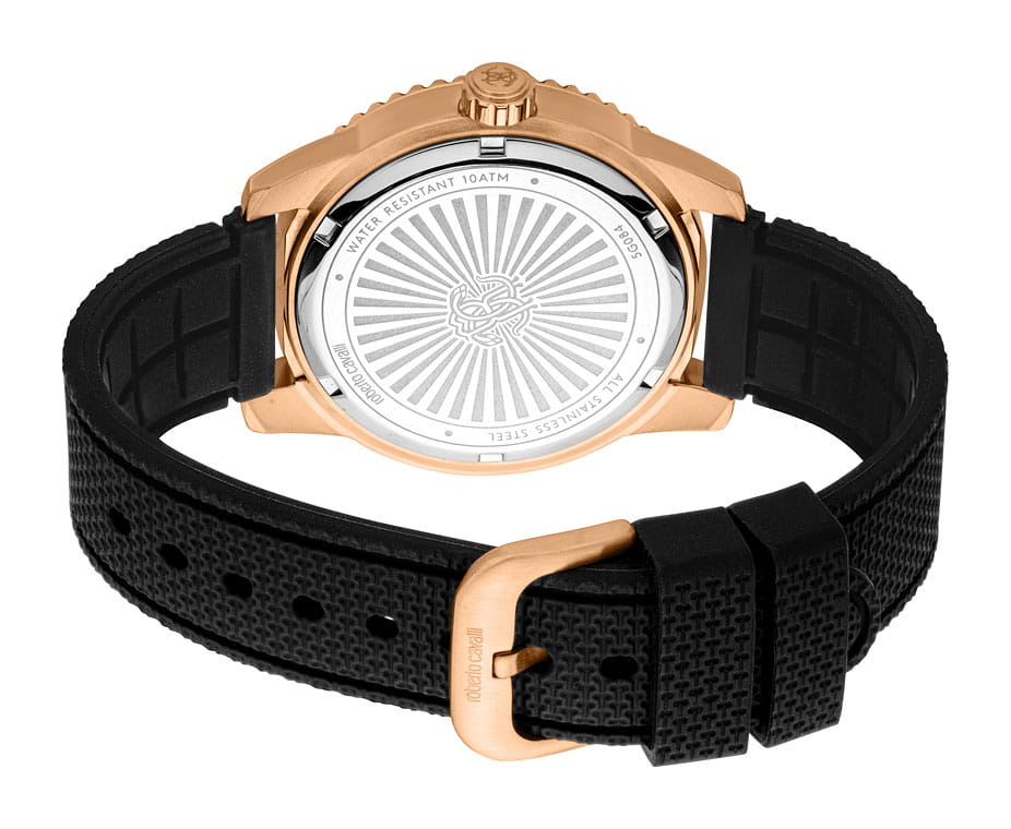 Погрузитесь в мир роскоши и безупречного стиля с мужскими наручными часами ROBERTO CAVALLI RC5G084P1035. Эти часы – воплощение смелого дизайна и итальянской элегантности, созданные для мужчины, который ценит внимание к деталям и не боится заявить о себе. Круглый корпус диаметром 42 мм выполнен из нержавеющей стали с PVD-покрытиемPVDУльтратонкое покрытие наносится в технике вакуумного напыления, сочетает в себе нитрид титана особой прочности со слоем золота или оксида хрома. Несёт в себе декоративную или защитную функцию., толщина корпуса составляет 11 мм, что придает модели выразительный внешний вид и надежную защиту от внешних воздействий. Циферблат, искусно оформленный фирменными элементами Roberto Cavalli, притягивает взгляд и подчеркивает ваш безупречный вкус. Часы оснащены кварцевым механизмом, также обладают функцией отображения даты, что делает их удобными для ежедневного использования. Минеральное стеклоМинеральное стеклоМинеральное стекло представляет собой искусственно выращенный минерал кварца. Такое стекло отличается особой устойчивостью к повреждениям и царапинам. Уступает по некоторым качествам сапфировому стеклу. защищает часы от царапин. Водозащита 100 метров, позволит плавать, нырять и заниматься другими водными видами спорта. Силиконовый ремешок на стандартной застёжке обеспечивает комфортное ношение. Поворотный безельБезельВнешний ободок, закрепляющий стекло. В спортивных часах так называется поворотное кольцо с делениями на циферблате, выполняет роль таймера – замеряет отрезки времени на шкале. Неподвижный безель – элемент декора. Однонаправленно вращающийся безель на дайверских часах позволяет фиксировать моменты погружения и выныривания на поверхность. с PVD-покрытиемPVDУльтратонкое покрытие наносится в технике вакуумного напыления, сочетает в себе нитрид титана особой прочности со слоем золота или оксида хрома. Несёт в себе декоративную или защитную функцию.. Стрелки и метки с люминесцентным покрытиемЛюминесцентное покрытиеПозволяет считывать показания времени в темноте. Производители наносят на стрелки, часовые индексы, безель или поверхность циферблата светонакопительный состав, дающий холодное свечение. обеспечивают отличную читаемость в любое время суток.