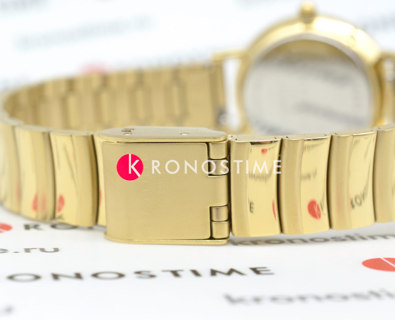 Перламутровый циферблат дополнен золотистыми стрелками и метками, что подчёркивает изысканный стиль модели. Браслет из нержавеющей стали с PVD-покрытиемPVDУльтратонкое покрытие наносится в технике вакуумного напыления, сочетает в себе нитрид титана особой прочности со слоем золота или оксида хрома. Несёт в себе декоративную или защитную функцию. и раскладной застёжкойРаскладная застёжкаТакой тип застёжки используется только на браслетах из металла. Она никогда не раскрывается полностью, происходит разделение на 2 и более частей. Раскладывающая застёжка снизит вероятность потери часов к минимуму. обеспечивает комфортное ношение и долговечность.